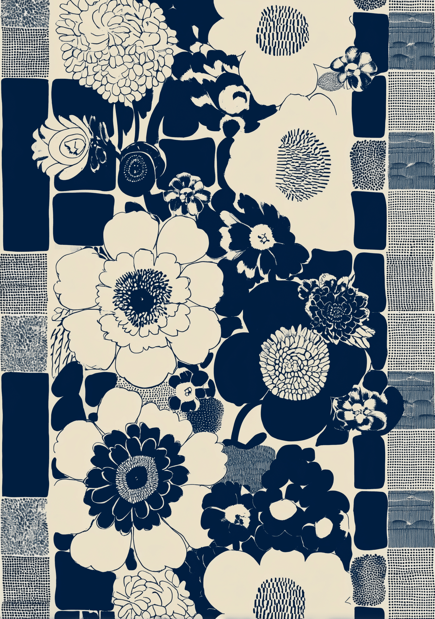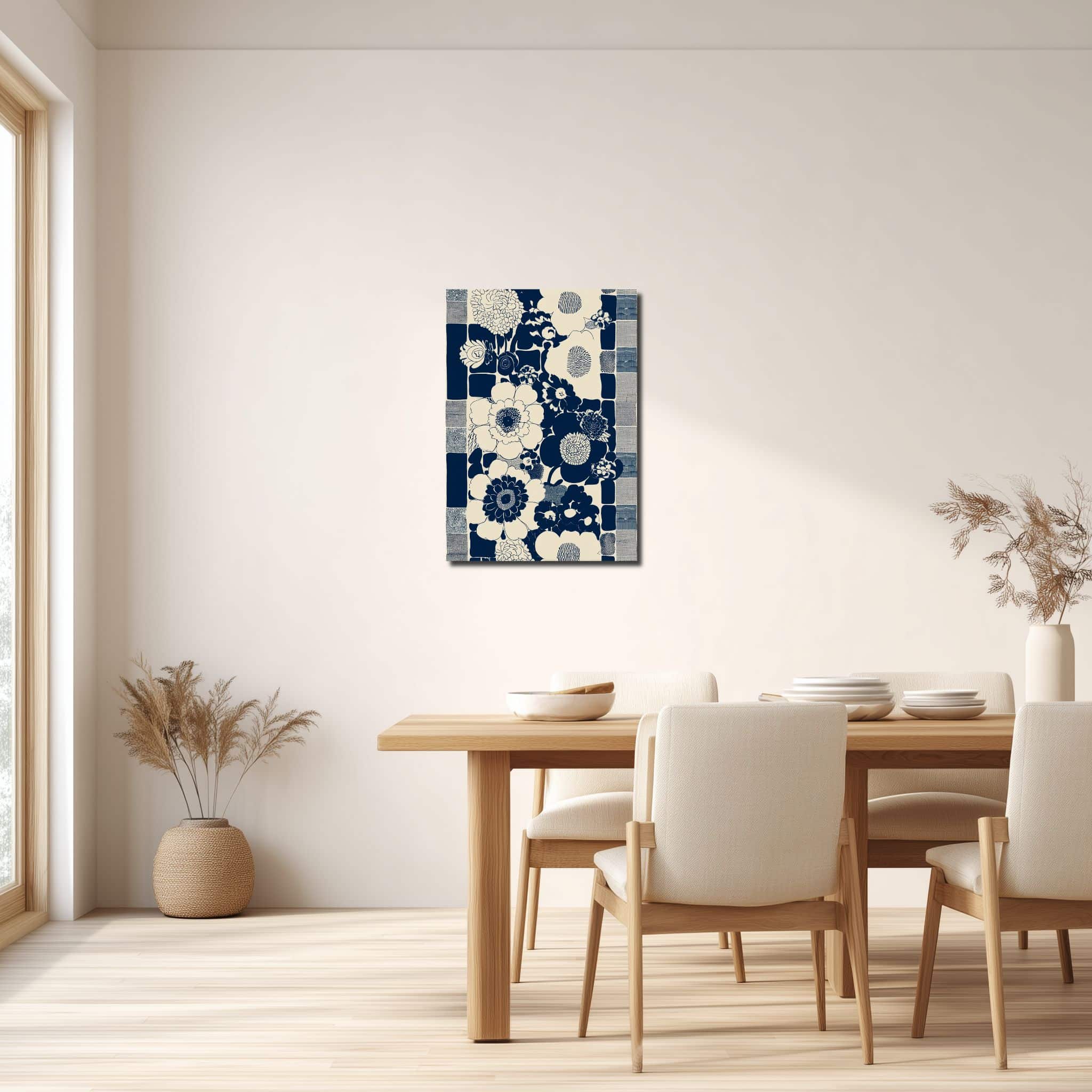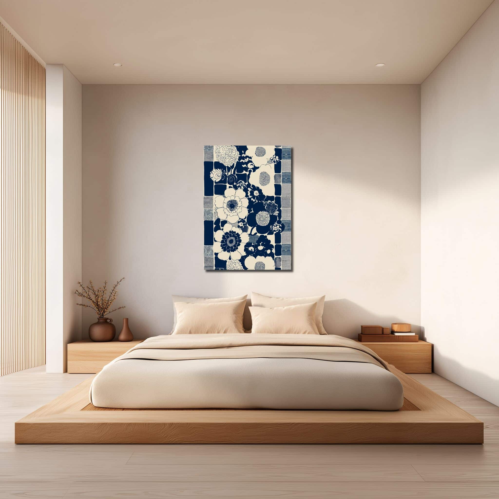 深みのあるネイビーを基調に、アイボリーの花や葉をリズミカルに重ねた ネイビー花柄 北欧 キャンバスアート は、版画のようなグラフィカルな表現と装飾性をあわせ持つ一枚です。縦構図の中に花芯や葉のモチーフがバランスよく配置されており、華やかさがありながらも落ち着いた印象にまとまるため、空間に上品なアクセントを添えてくれます。