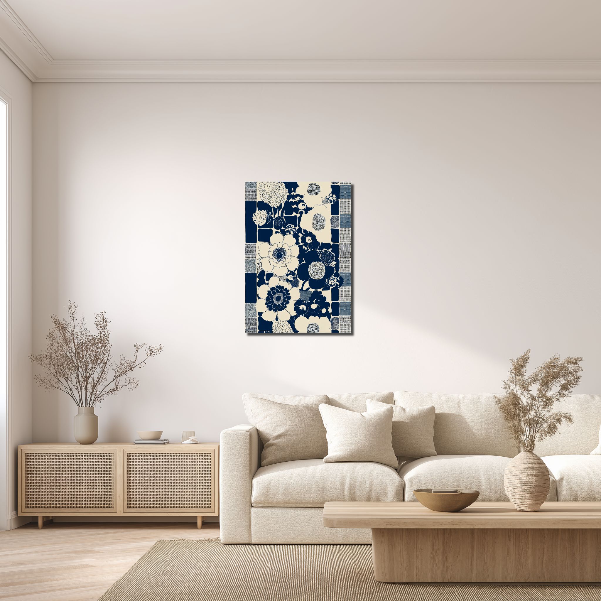 ネイビーとアイボリーの明快なコントラストに、やわらかなブルーグレーが加わることで、視線を引きつけながらも強すぎない洗練された表情を生み出します。ネイビー花柄 北欧 キャンバスアート は、白壁にはすっきりと映え、木目やファブリックのあるインテリアには穏やかな奥行きを与え、北欧ミニマルな空気感を心地よく整えます。