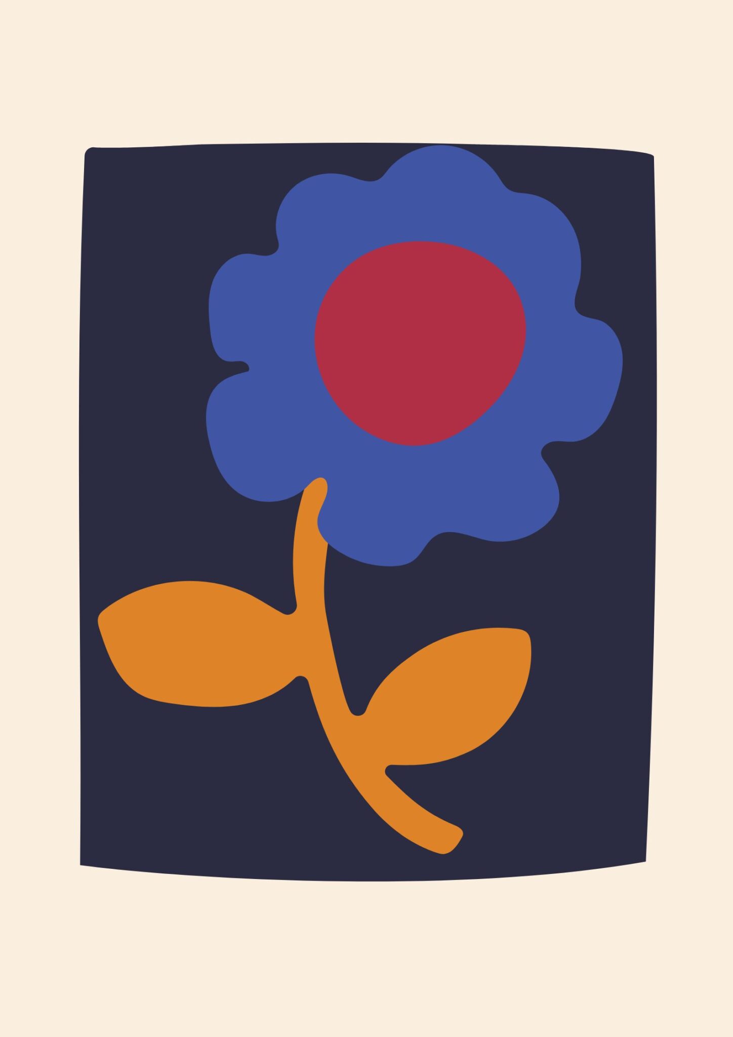 大胆なブルーフラワーとオレンジのステムを配置した抽象デザインです。