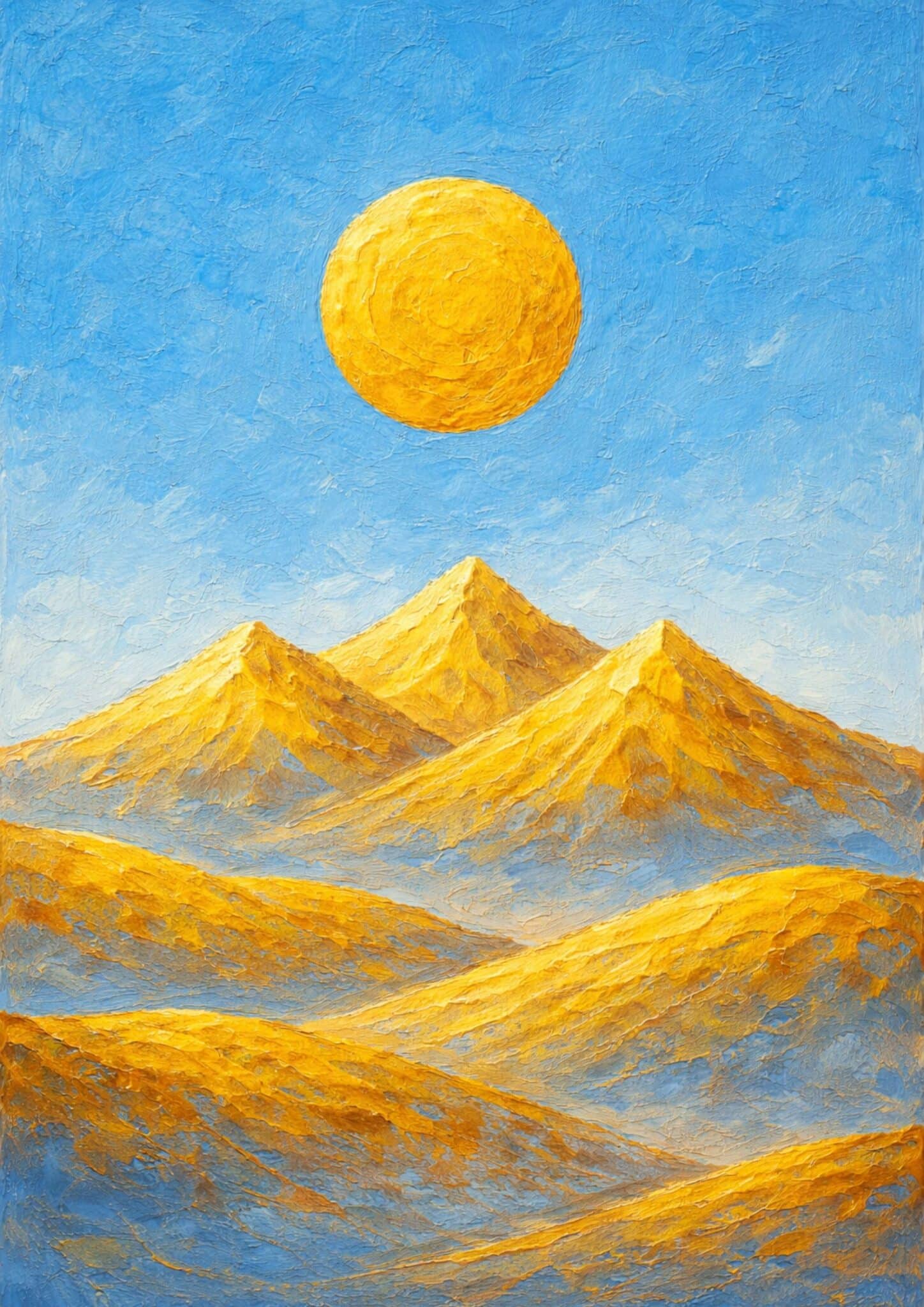 黄金色に輝く山々と静かな空を描いた