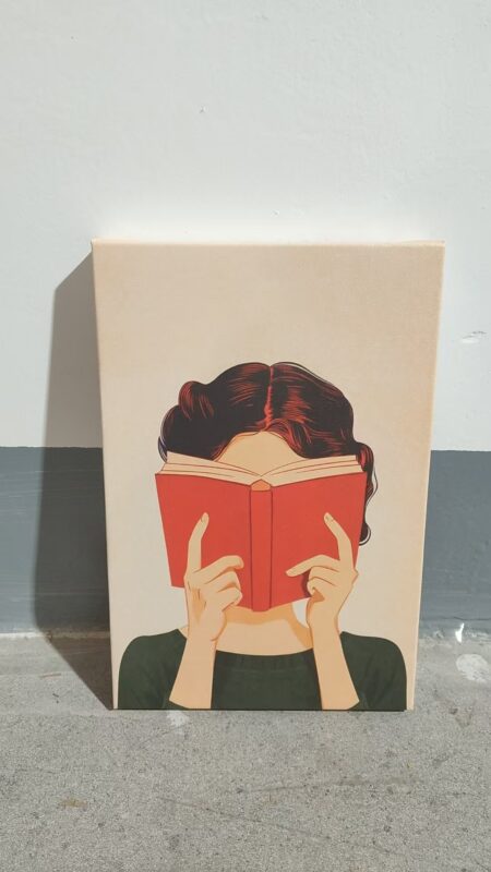 生成りと深緑の落ち着いた色の中で、本の赤だけがすっと目に入ります。人物モチーフでも主張が強すぎず、壁に掛けると空気が少し整うような見え方です。リビングでは会話の邪魔をせず、書斎や玄関では視線の止まるポイントとしてきれいに収まります。