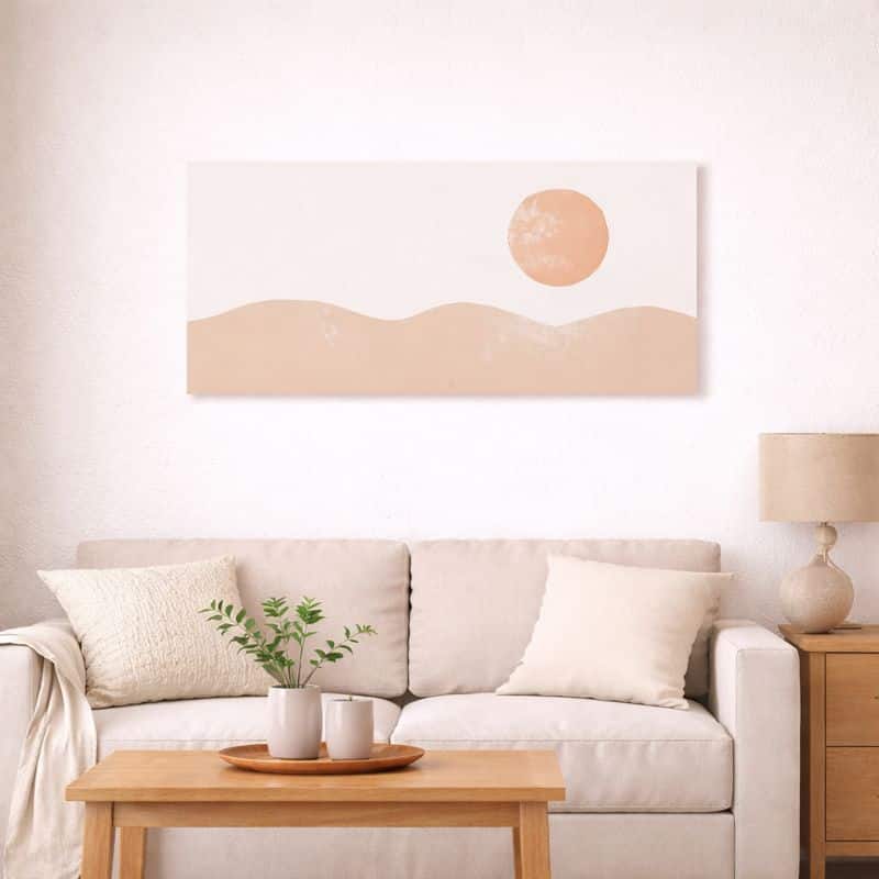 やさしいベージュトーンとシンプルなフォルムで描かれた、北欧ミニマルな抽象アート。