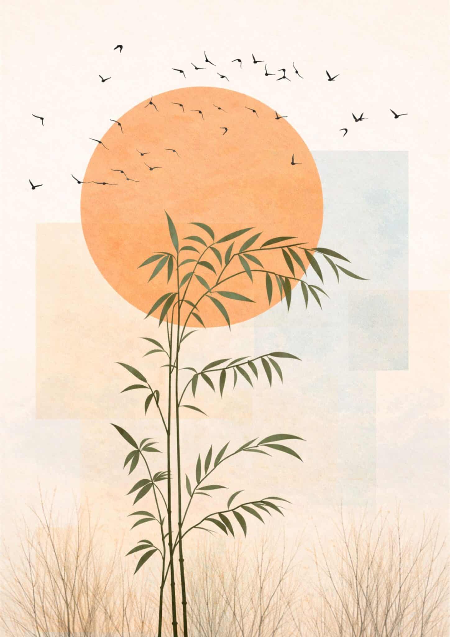 大きなサンモチーフと繊細な竹のシルエットを組み合わせた抽象デザインです。