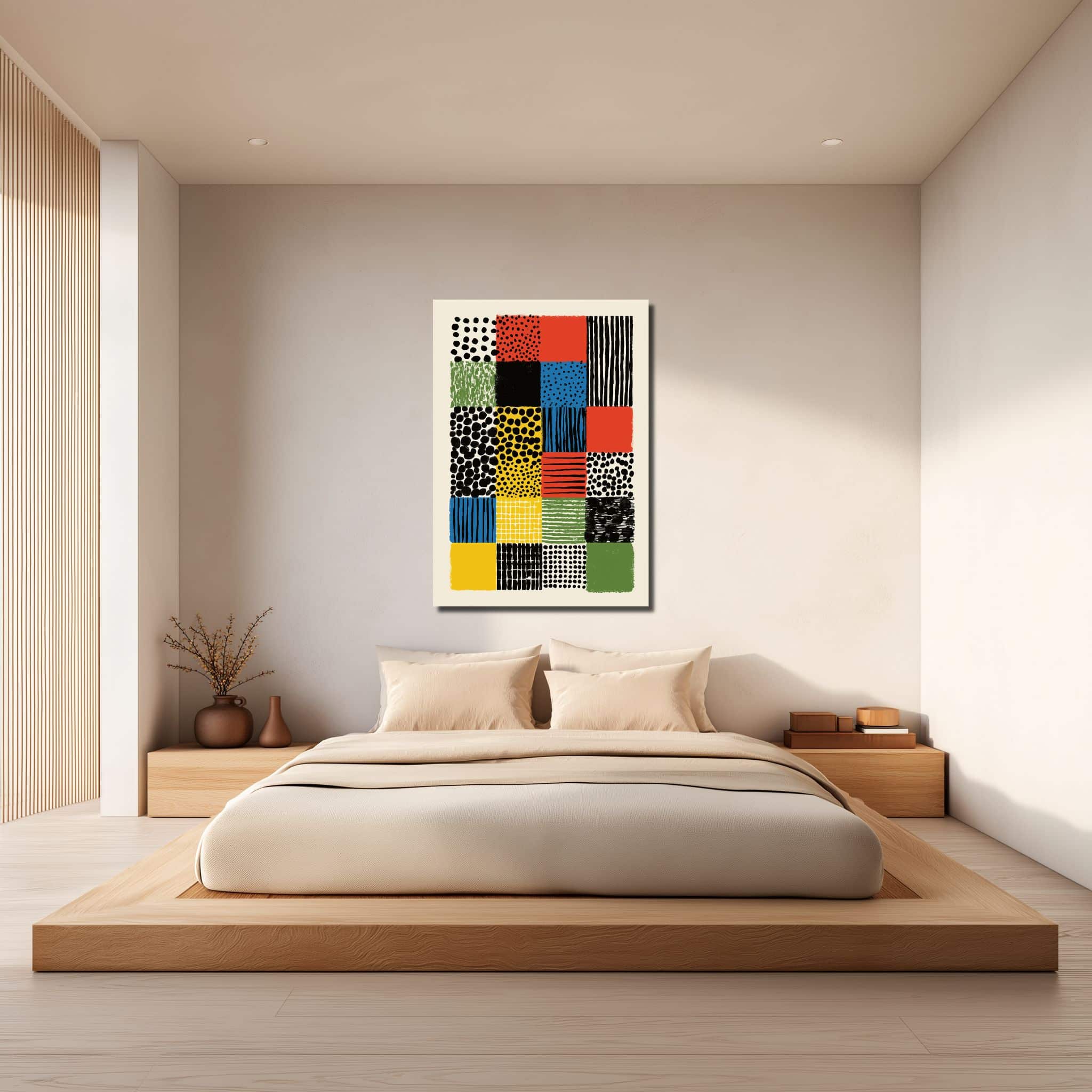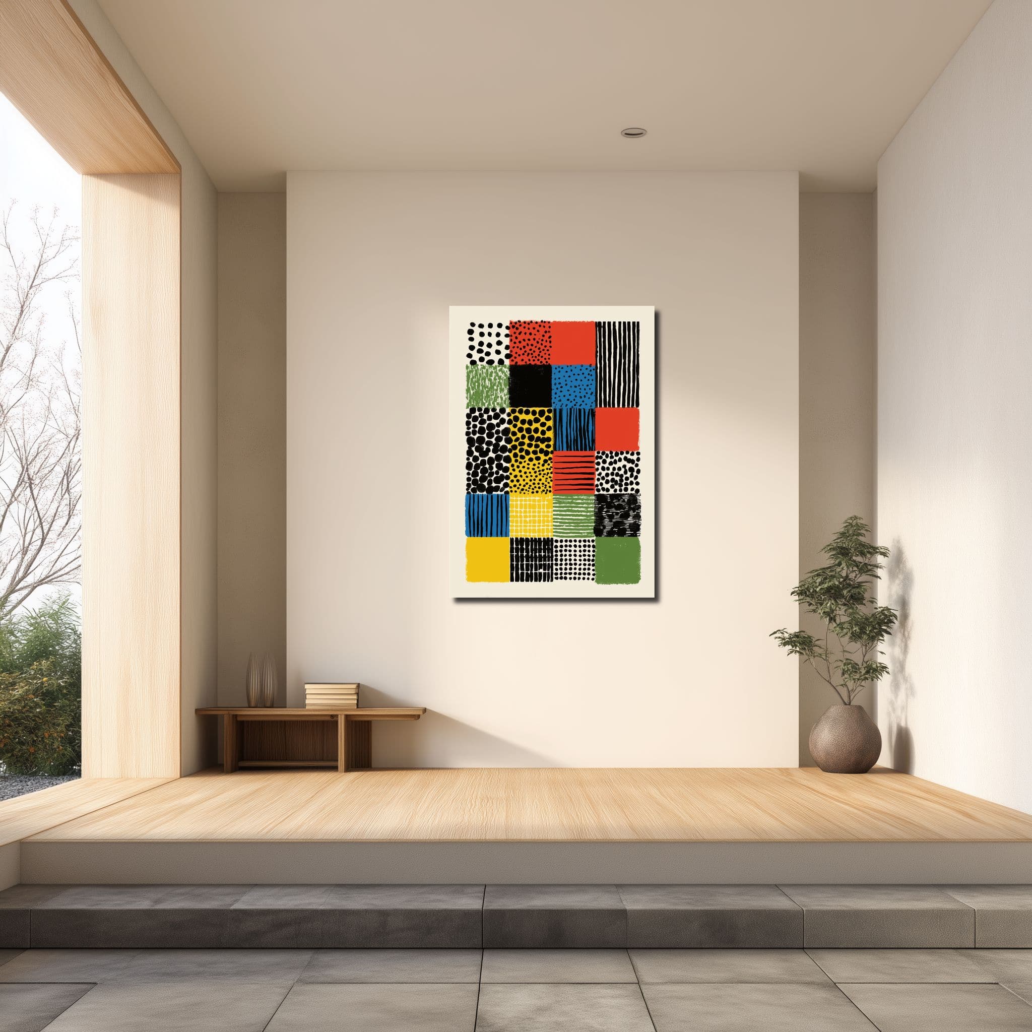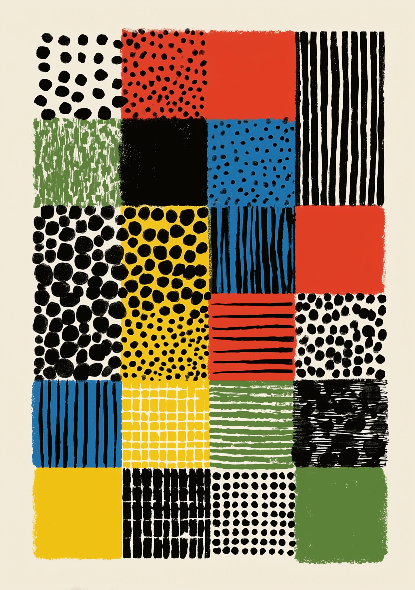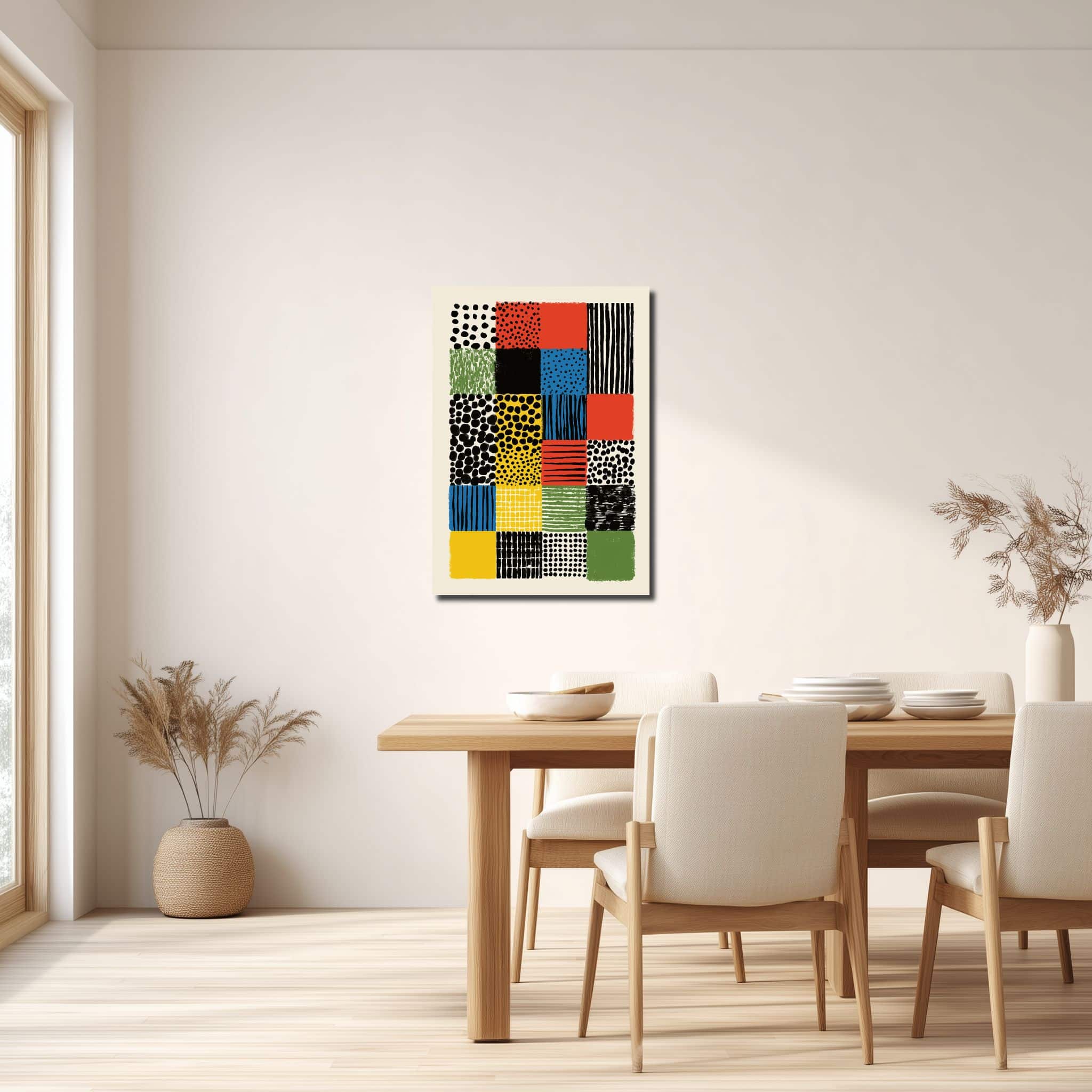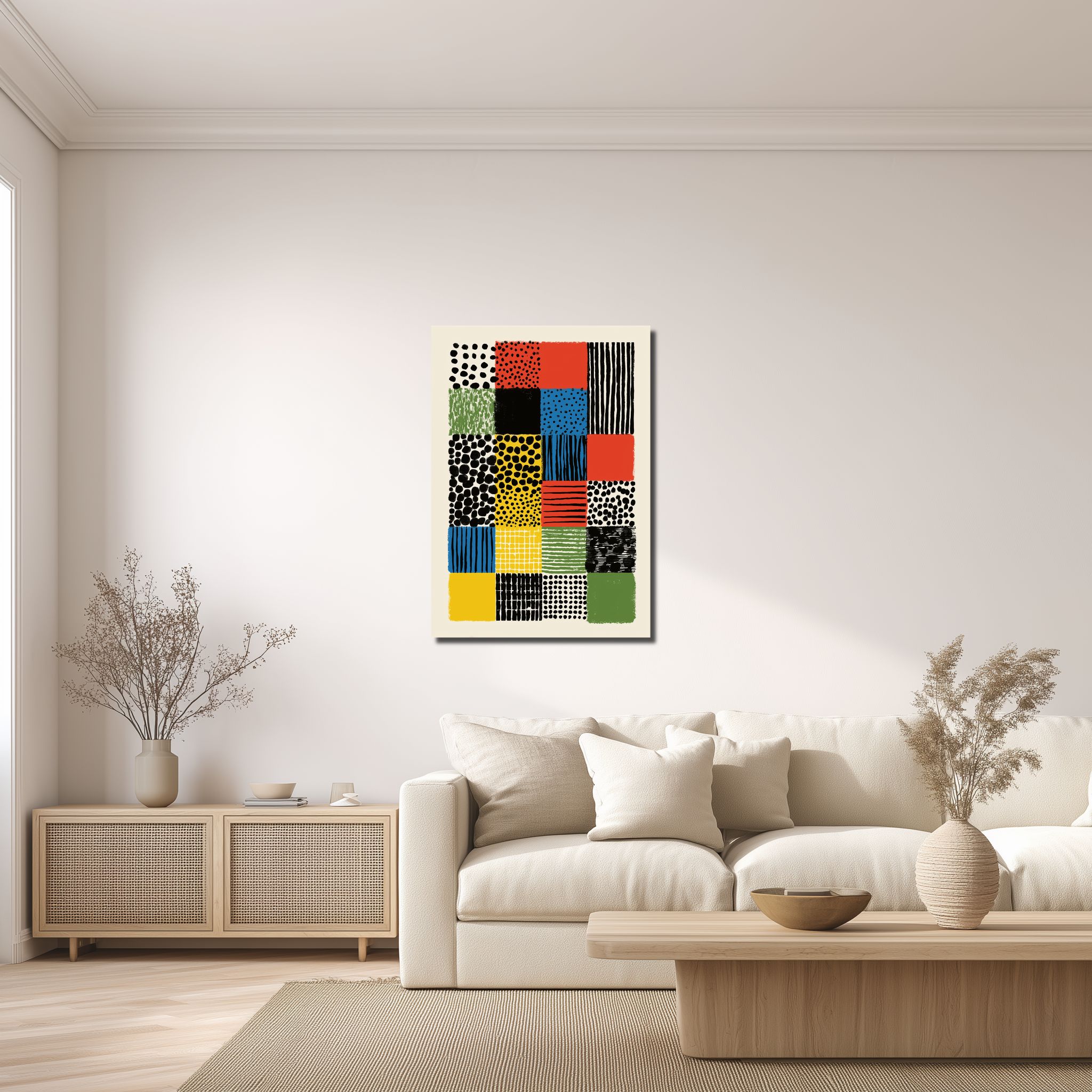水玉、縦縞、横のライン、塗りつぶした四角形が格子のように区切られ、ひとつの画面の中で軽やかに呼応する構成です。赤、青、黄、緑、黒の配色ははっきりしていますが、版画調のかすれや手描き風の質感があるため、見え方は固くなりすぎません。リビング 抽象アートとして壁に掛けると、まず色の楽しさが目に入り、そのあとに模様の反復が静かに残ります。
