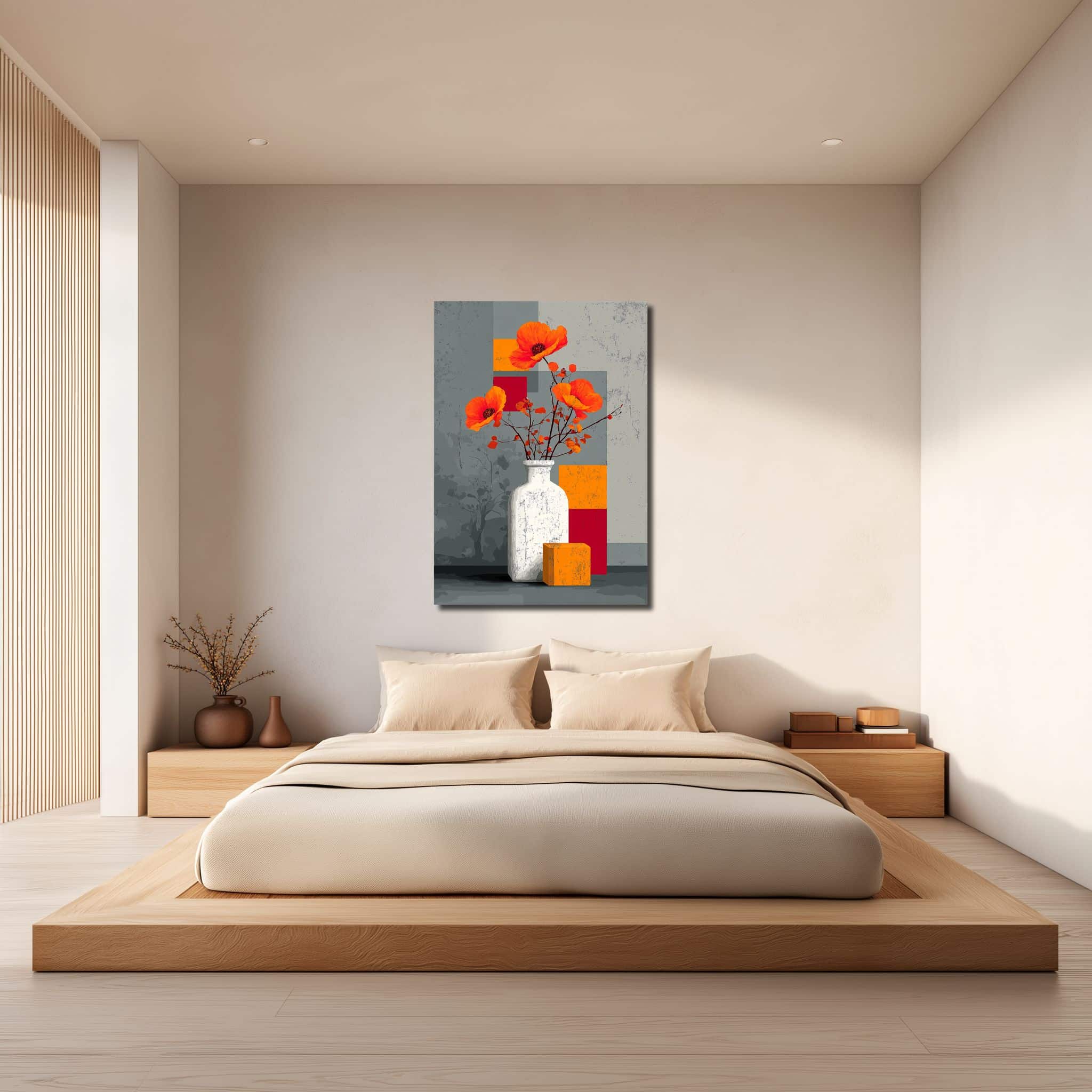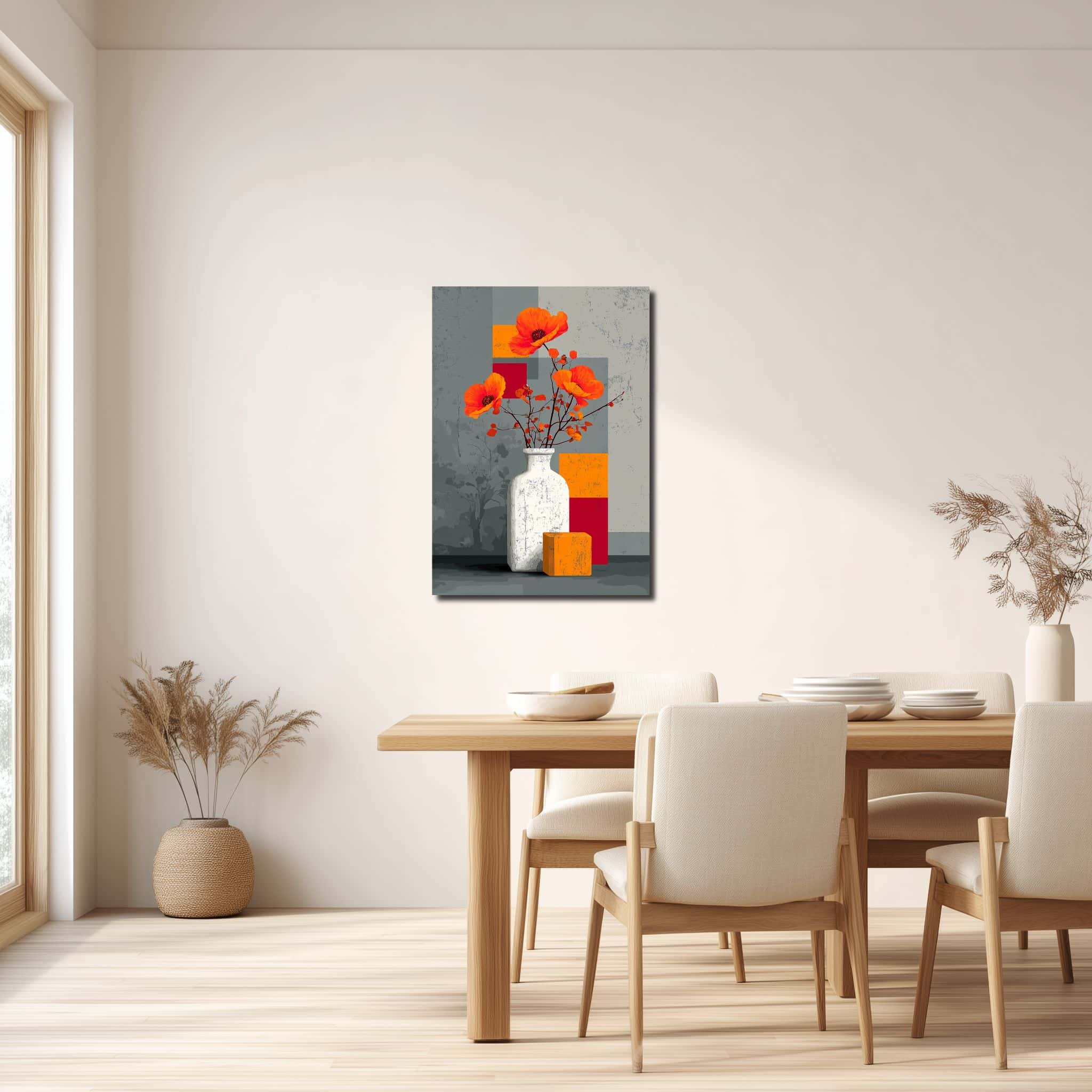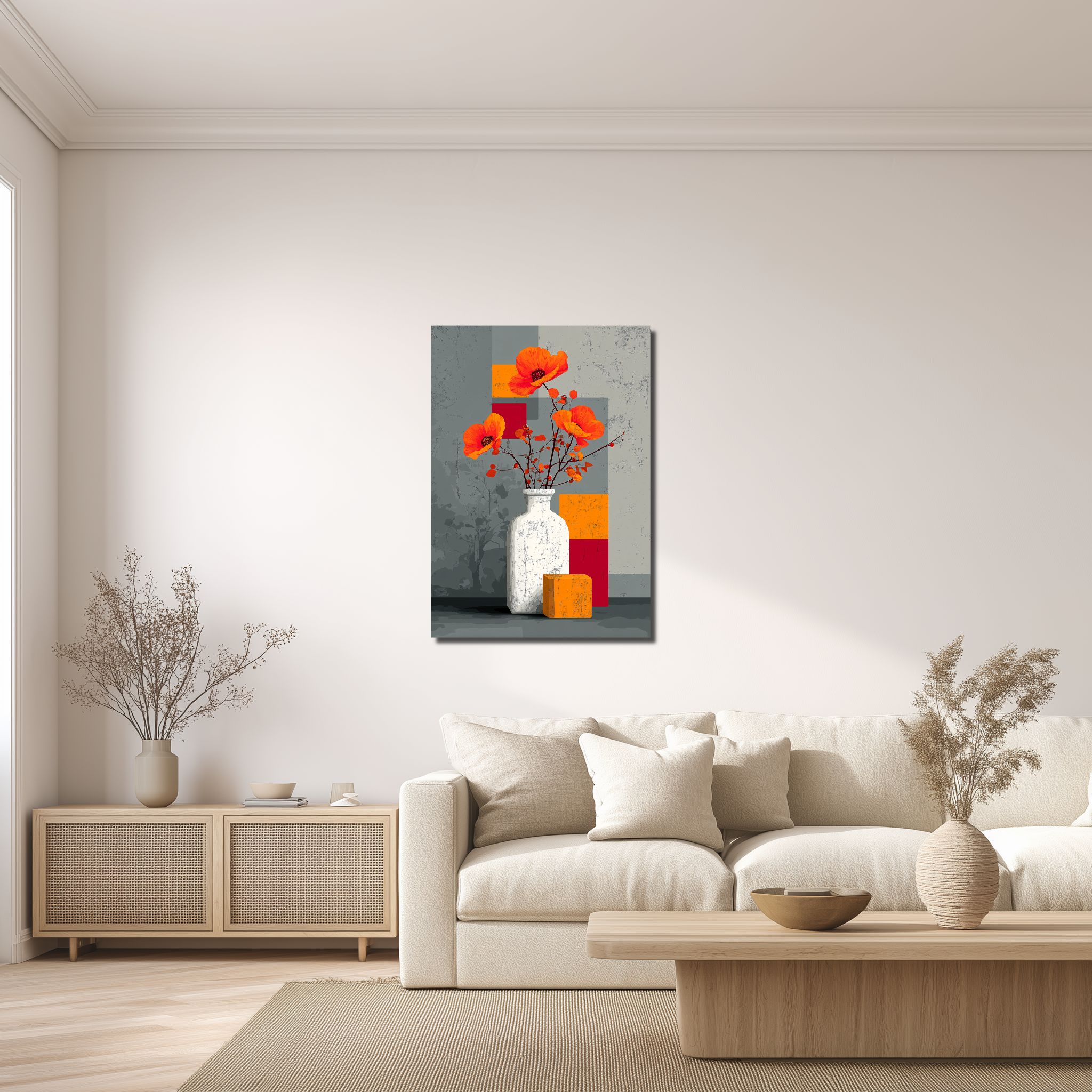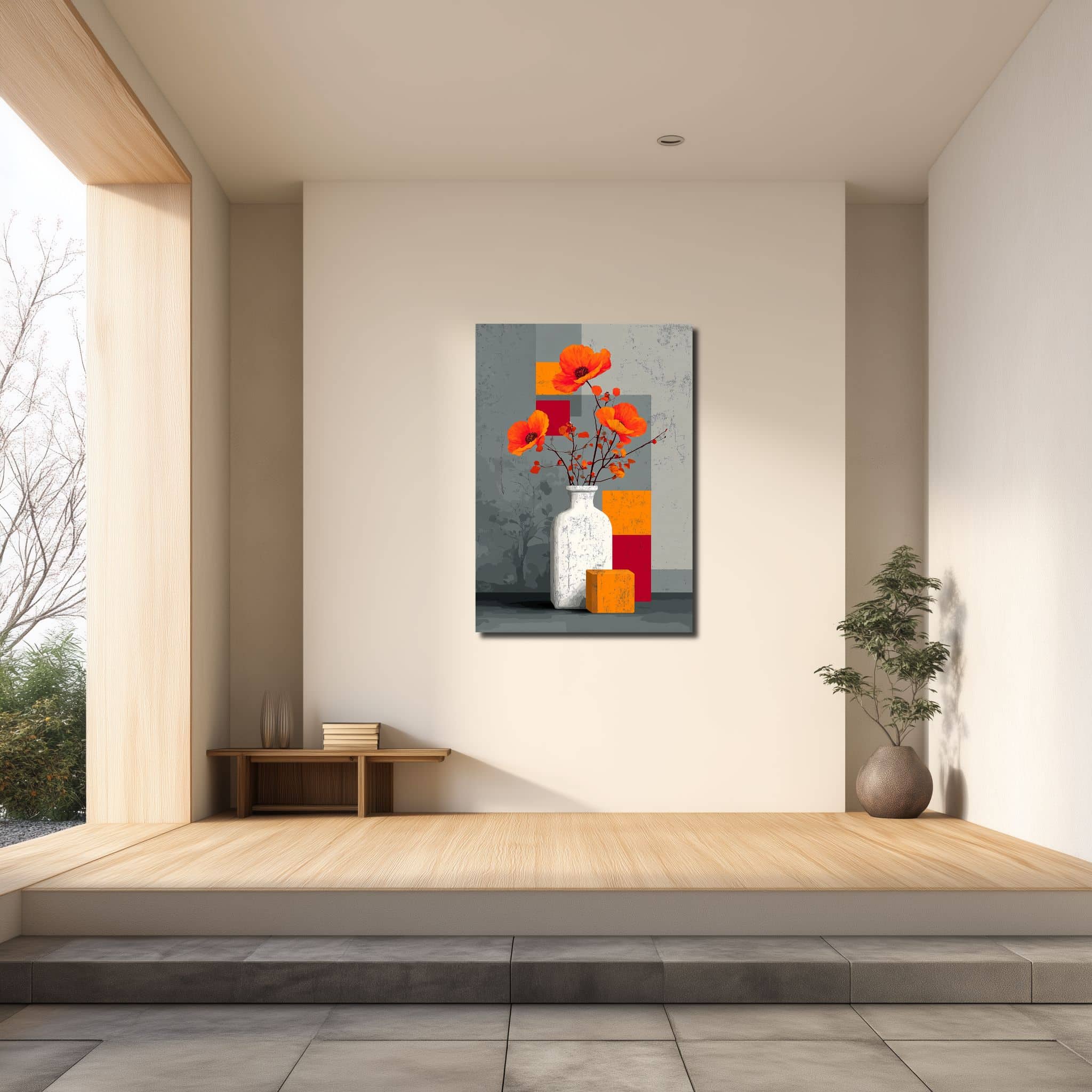 白い花瓶に生けられた赤橙の花が、すっきりとした縦構図の中で印象的に映える一枚です。幾何学的な背景と余白を活かしたレイアウトが、華やかさの中にも落ち着きをつくり、空間に静かな存在感を添えます。赤橙ブーケ モダン静物 キャンバスアートは、装飾的でありながら主張しすぎず、現代的なインテリアに心地よくなじむデザインです。