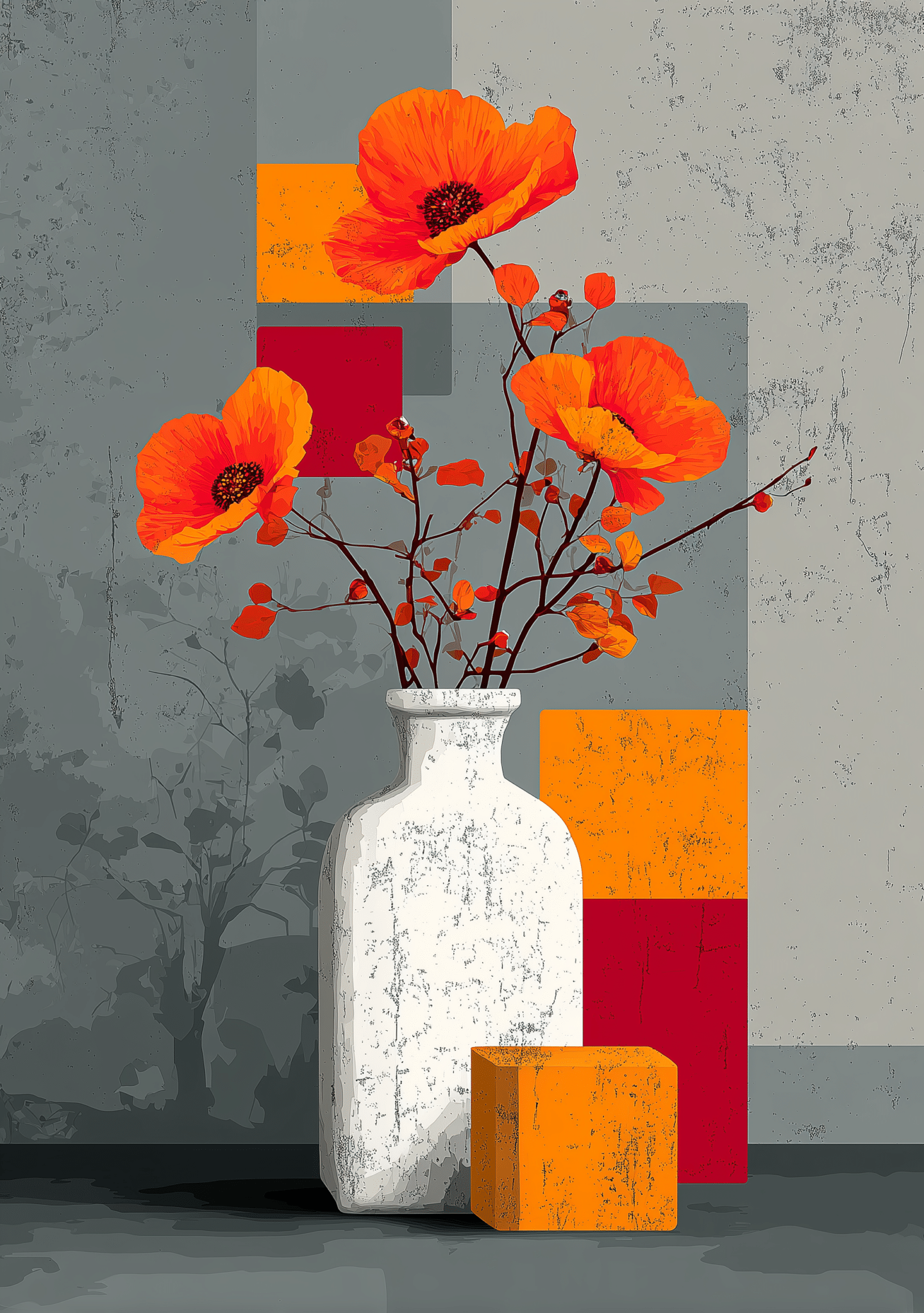鮮やかな赤とオレンジを中心に、白い花瓶、グレーや黒の引き締まった配色が重なり合い、洗練されたコントラストを生み出しています。明るさと深みを兼ね備えた色使いは、壁面にメリハリを与えながらも上品にまとまり、モダンな空気感を演出します。赤橙ブーケ モダン静物 キャンバスアートなら、シンプルな空間にも華やかなアクセントを自然に取り入れられます。