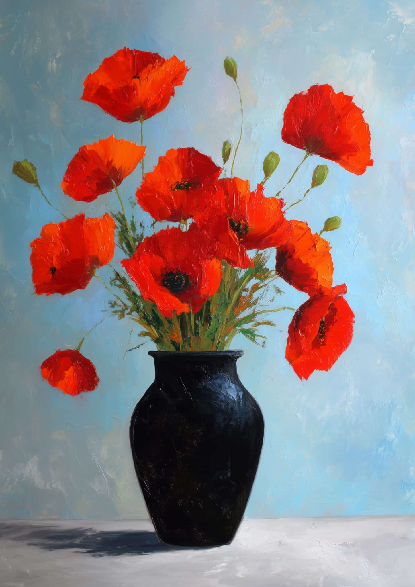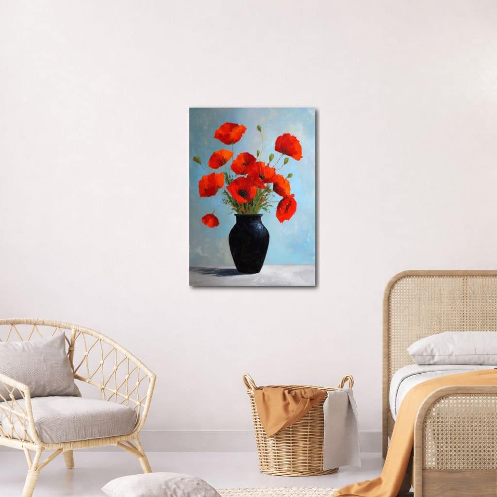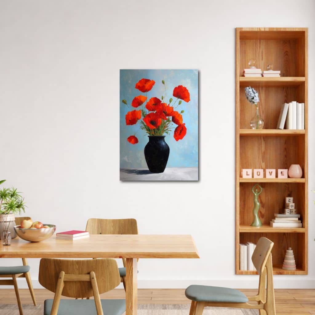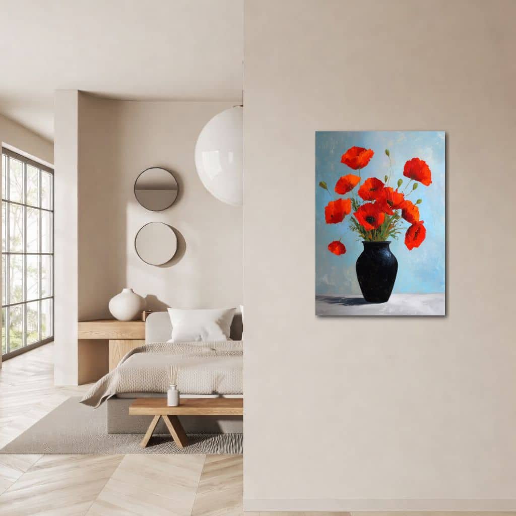 鮮やかなレッドポピーに、淡いブルーの背景とブラックベースを重ねることで、レッドポピー キャンバスアートならではの印象的なコントラストを空間に与えます。華やかさがありながらも重たくなりすぎず、お部屋を明るく見せつつ、やさしくモダンな雰囲気へ整えてくれる一枚です。