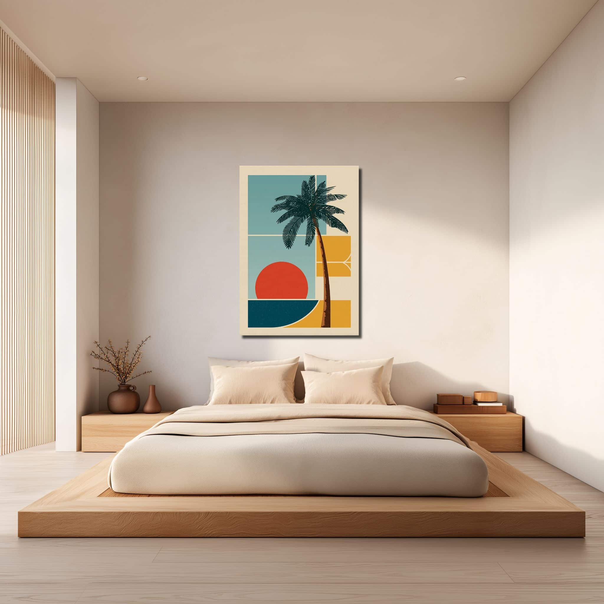 レトロモダンなヤシの木と夕日 キャンバスアートの印象的なデザイン