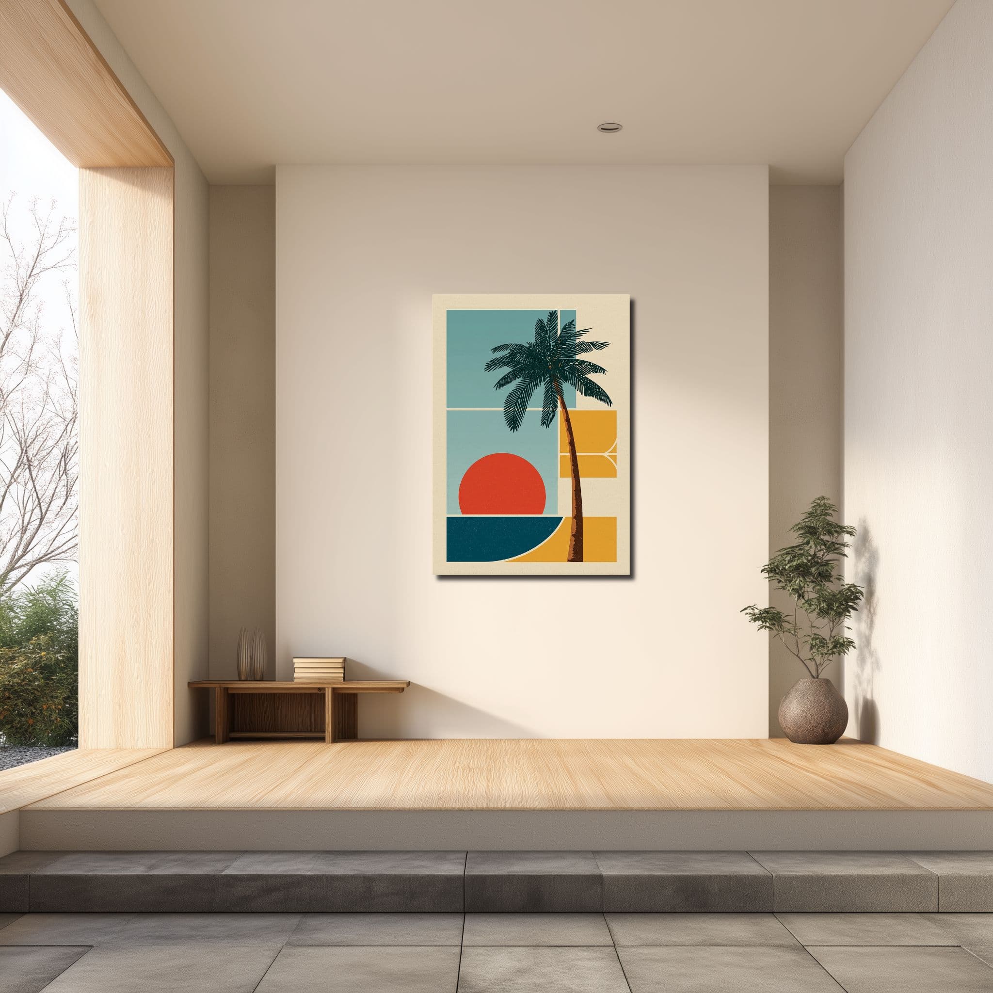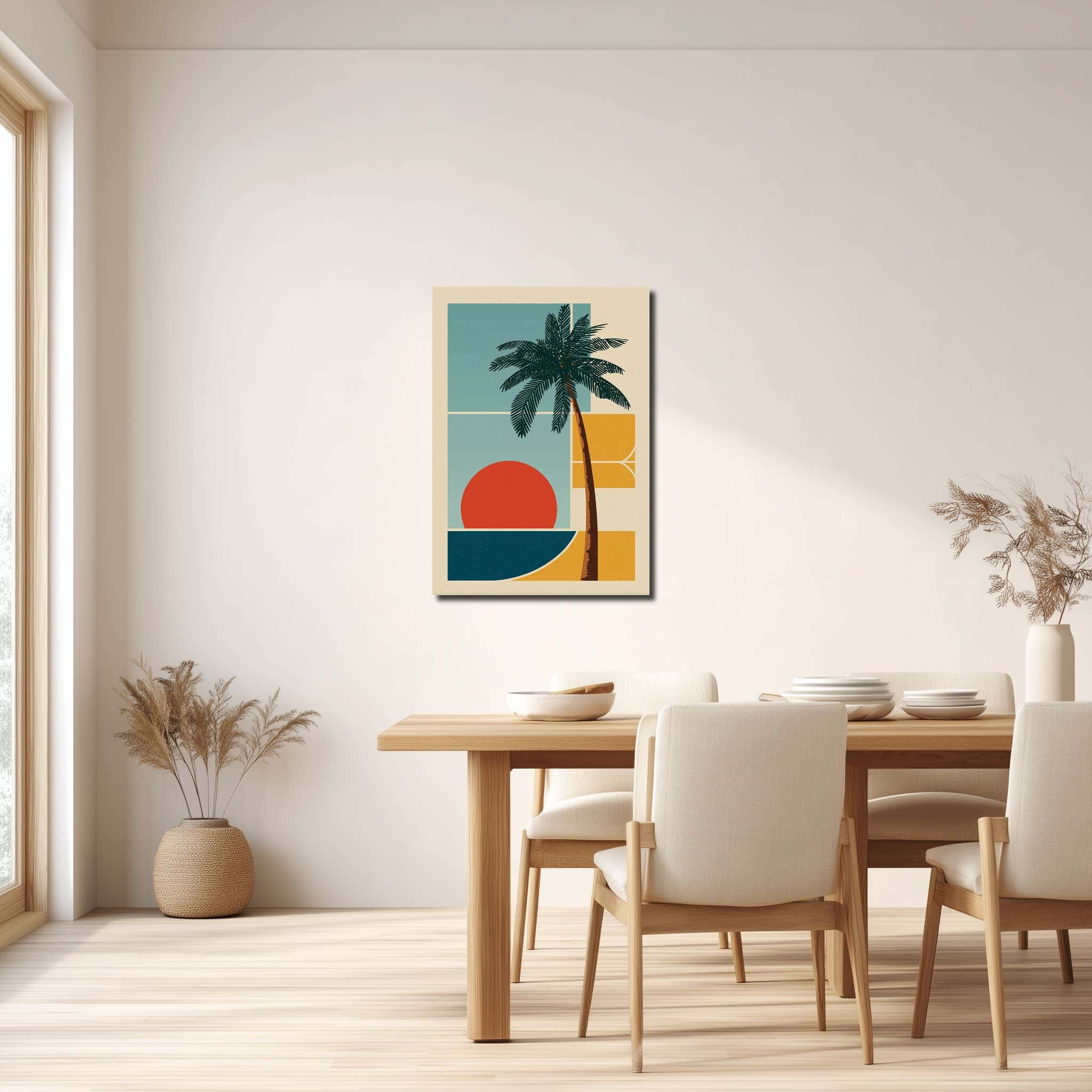 レトロモダンなヤシの木と夕日 キャンバスアートを、グラフィカルに楽しめる縦構図。南国らしい明るさと落ち着いた色面が、壁を軽やかに整えます。