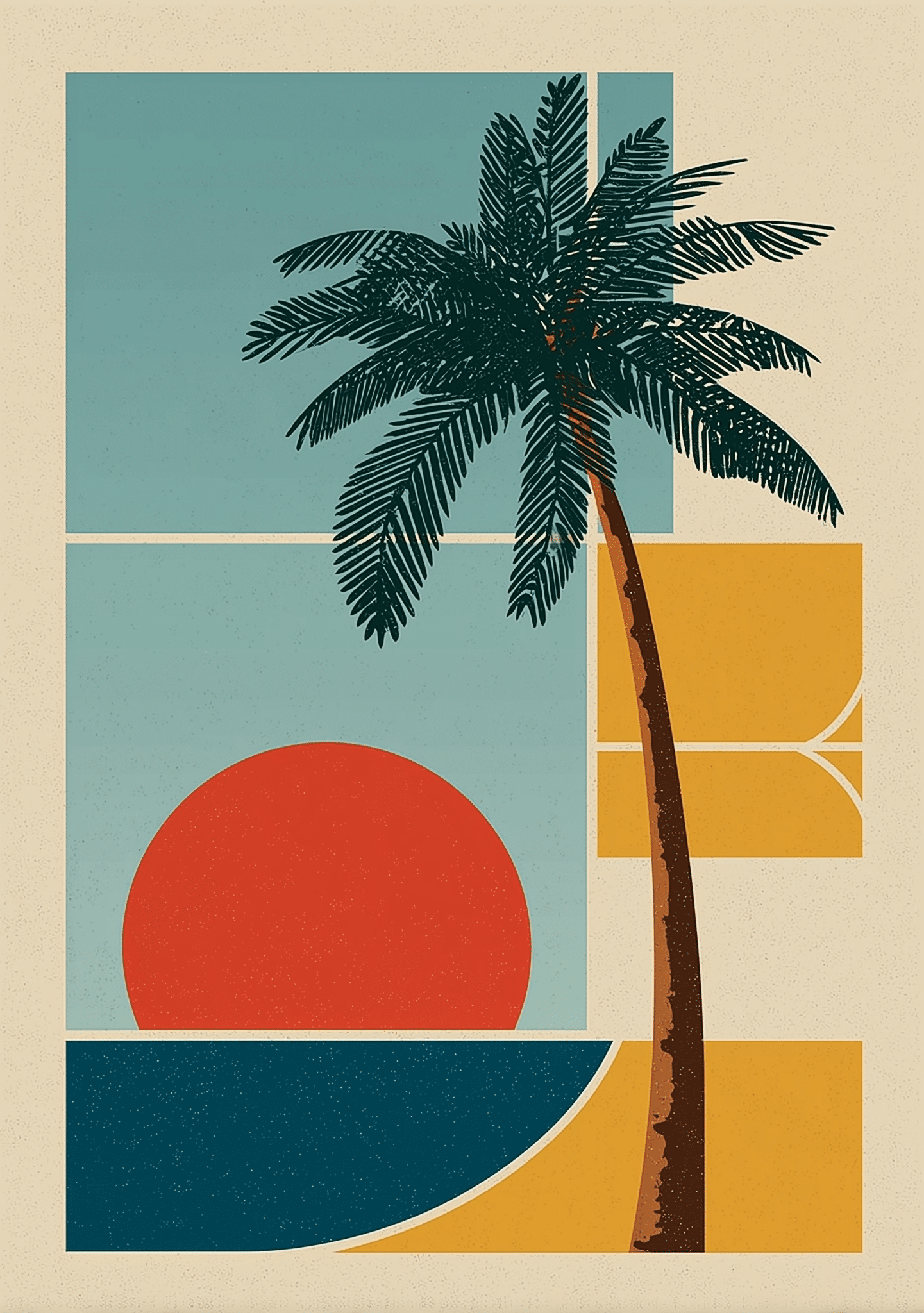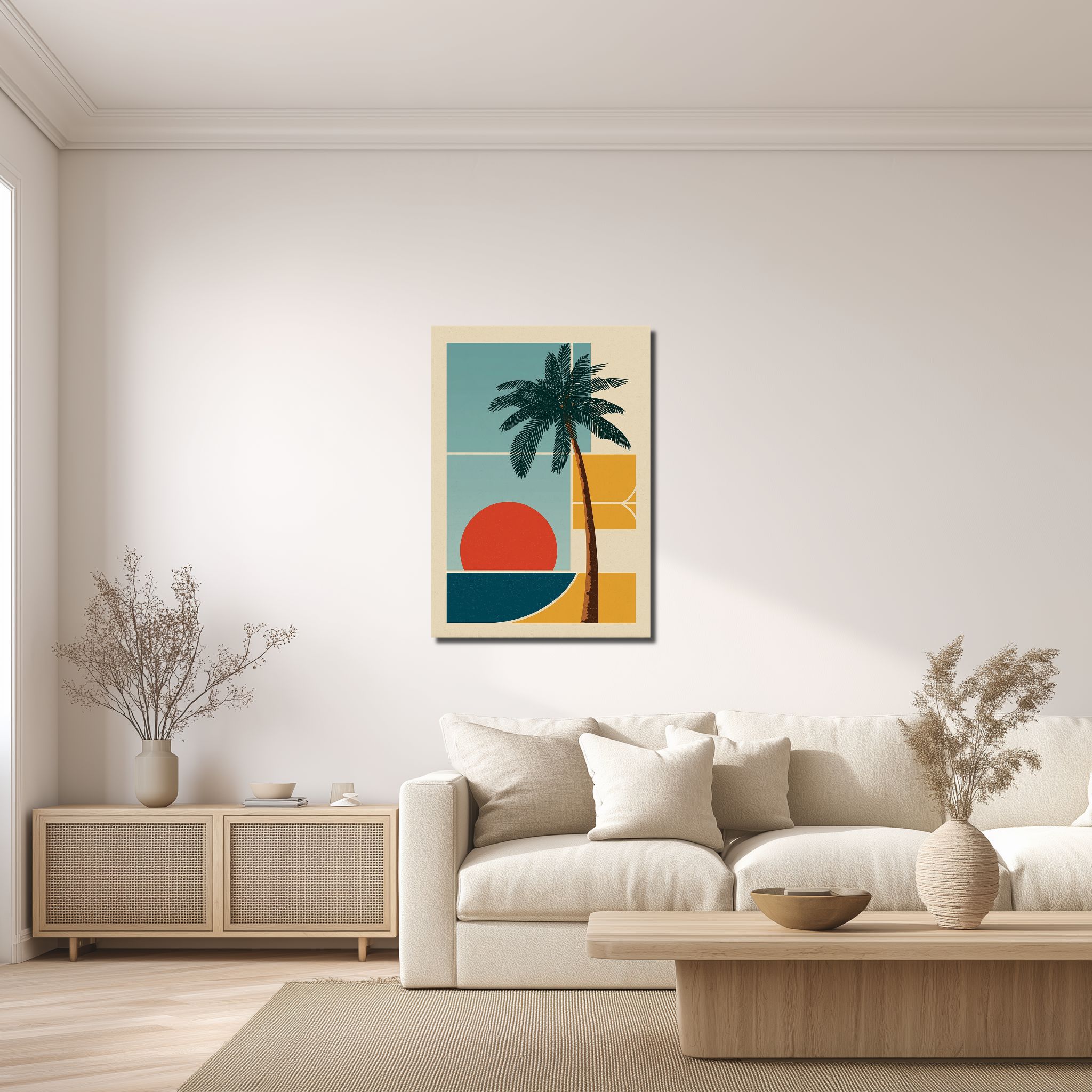 セージブルーをベースに、テラコッタやマスタードイエロー、深いネイビーを重ねた配色が壁の上ではっきり映ります。版画のように整理された輪郭とブロック状の面があることで、色数はあっても散らかって見えません。余白がしっかり取られているため、レトロモダンなヤシの木と夕日 キャンバスアートは明るさを出しながらも、視線を落ち着かせる見え方になります。