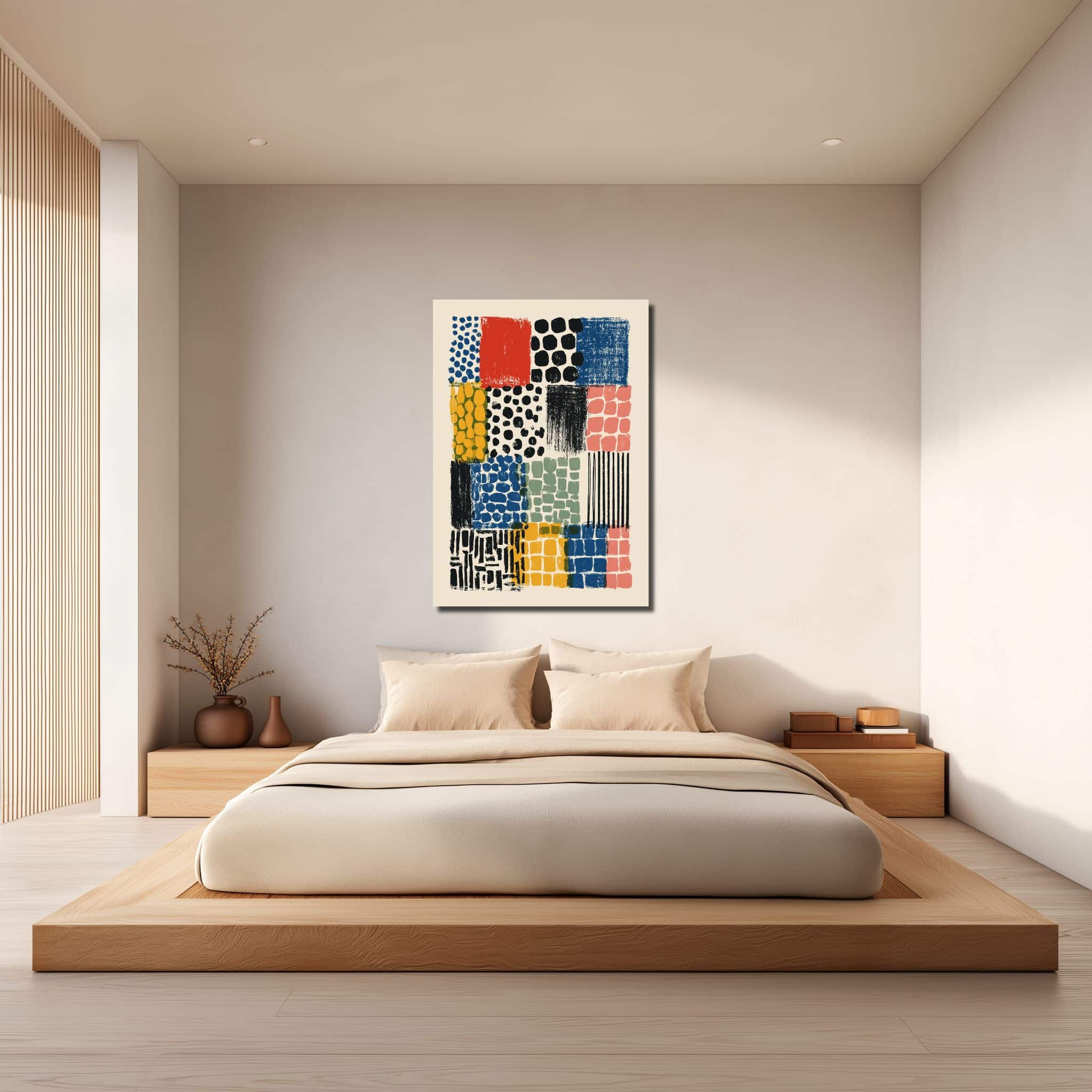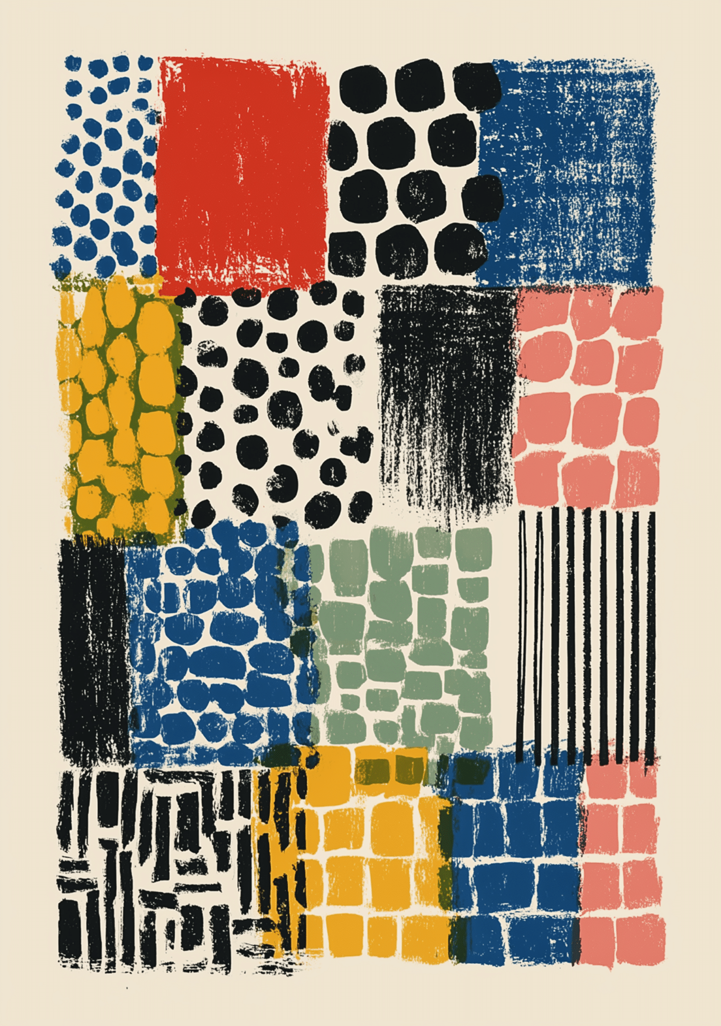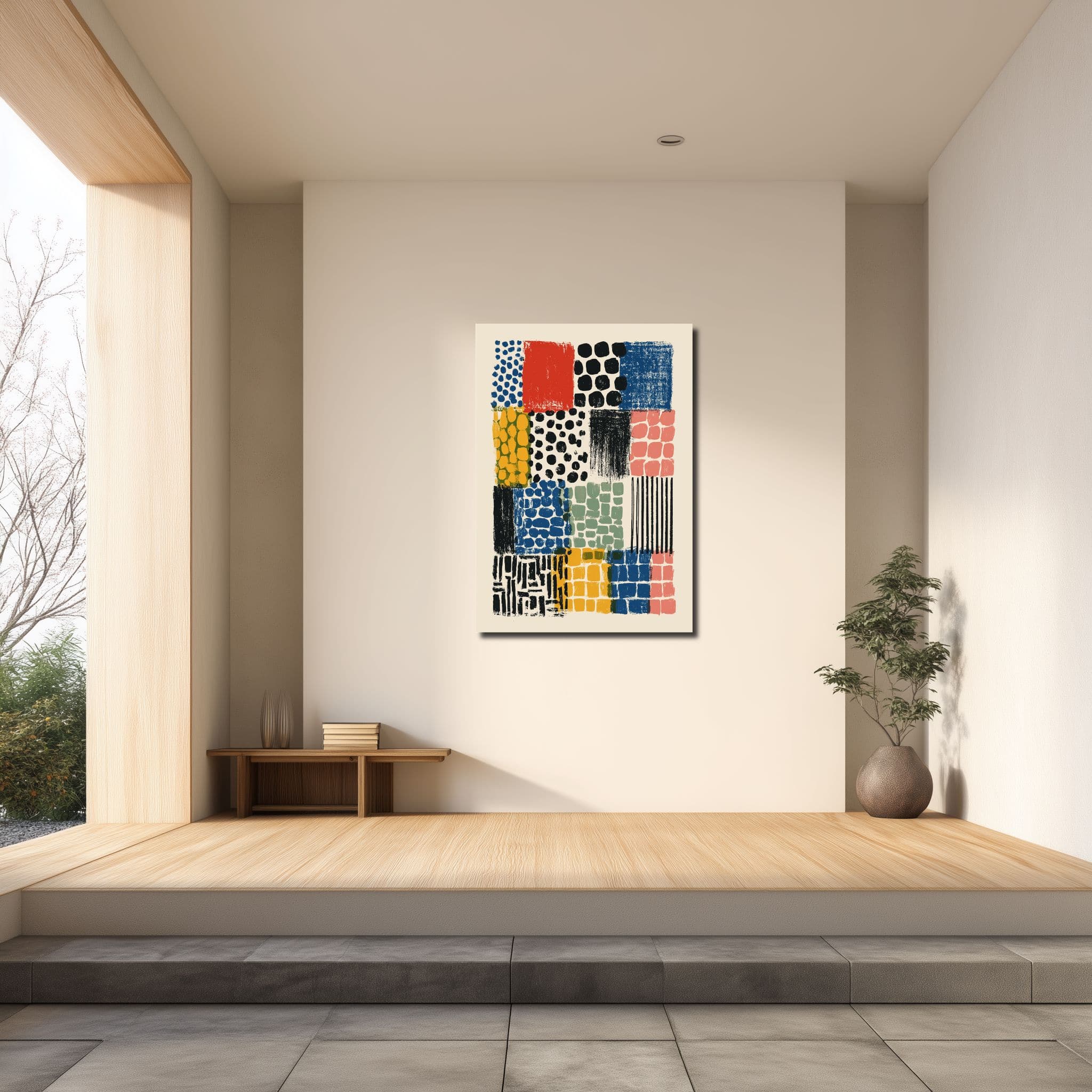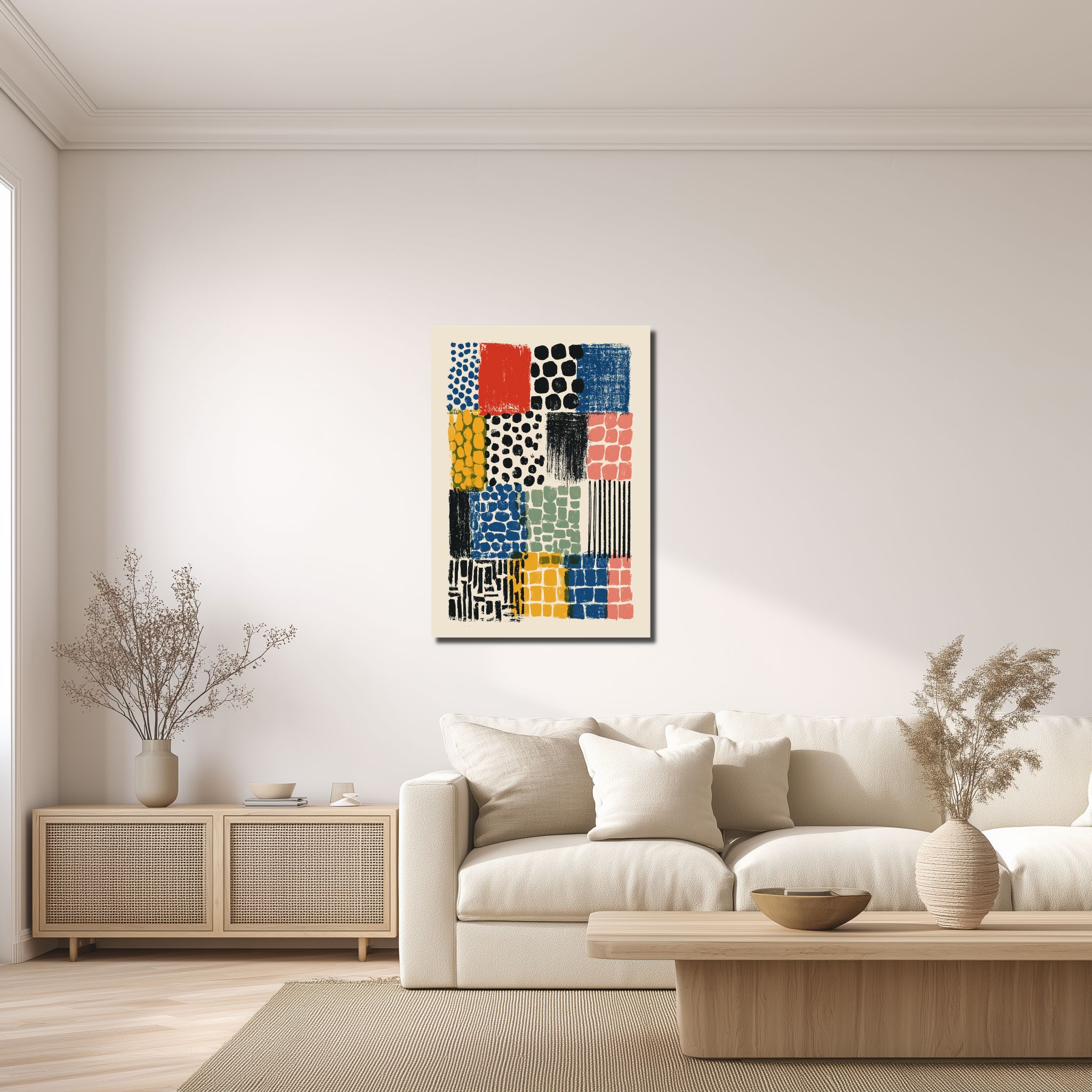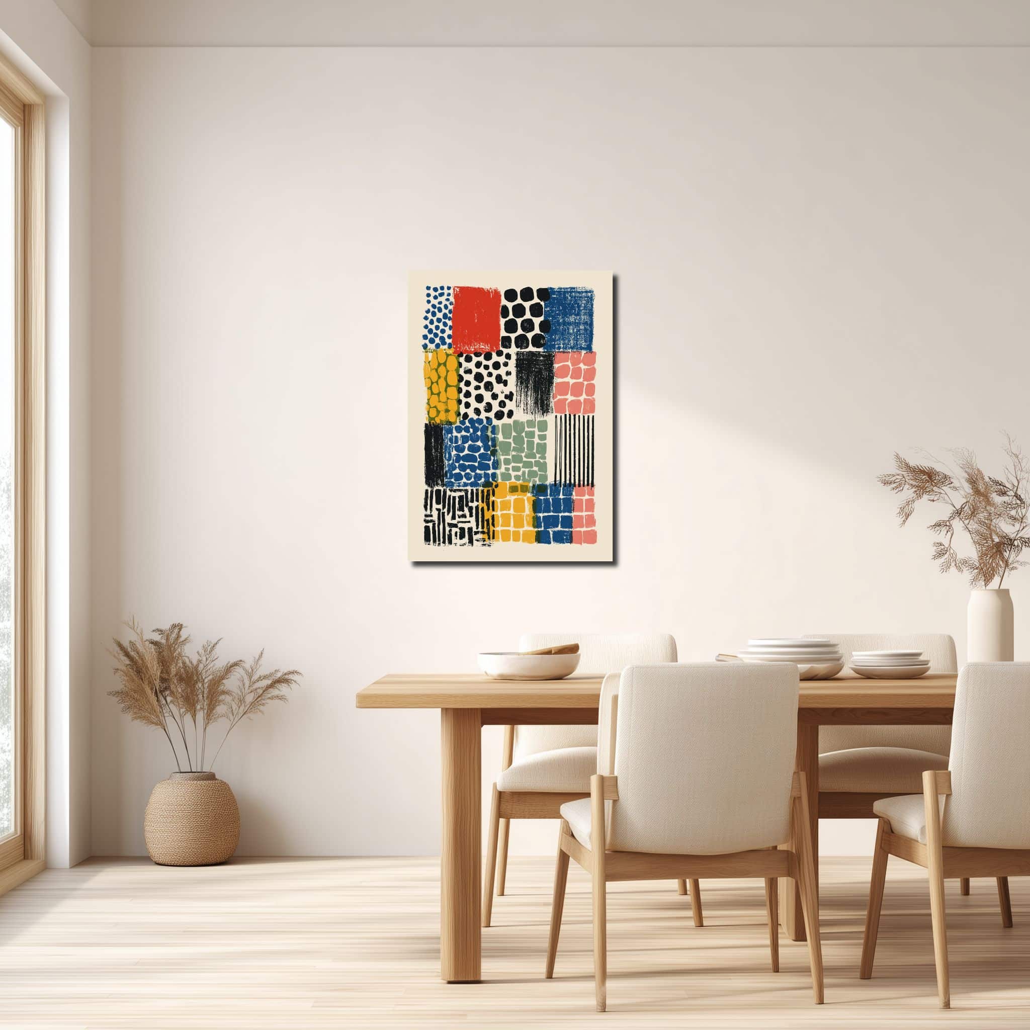 赤、青、黄を中心にしたブロックと丸いドットが重なり合う、版画のようなかすれ感が印象的な一枚です。整いすぎないスタンプ風の形や粗いテクスチャが効いていて、ポップで軽やかなのに、どこか落ち着いたレトロ感も残ります。縦構図の中にリズムよく要素が配置されているため、レトロポップ抽象 キャンバスアートとして壁に掛けたときも間延びせず、視線を自然に引き寄せます。