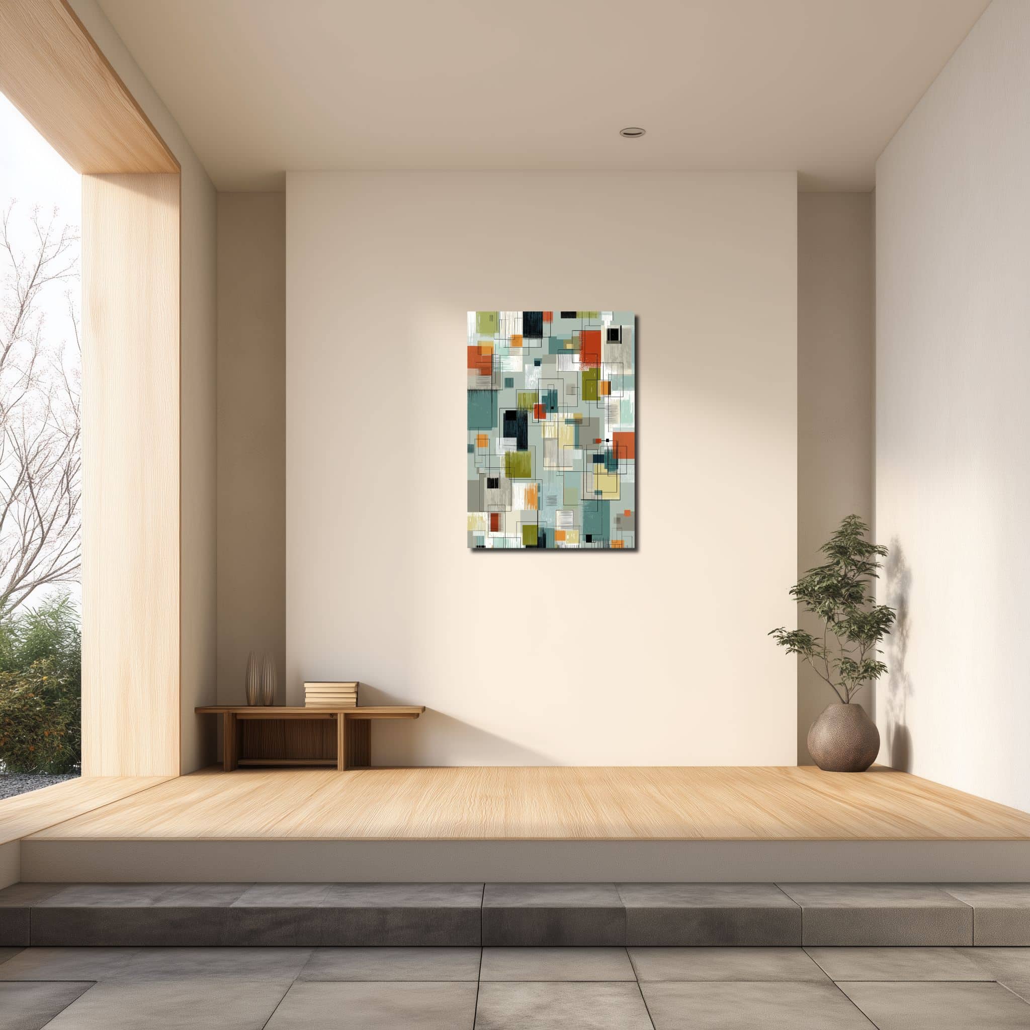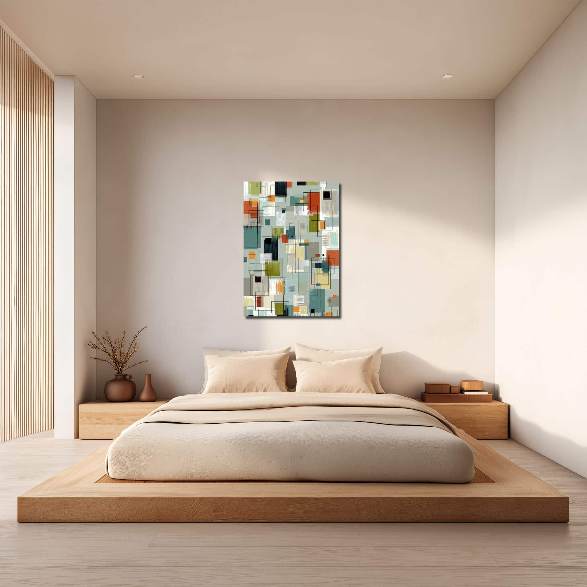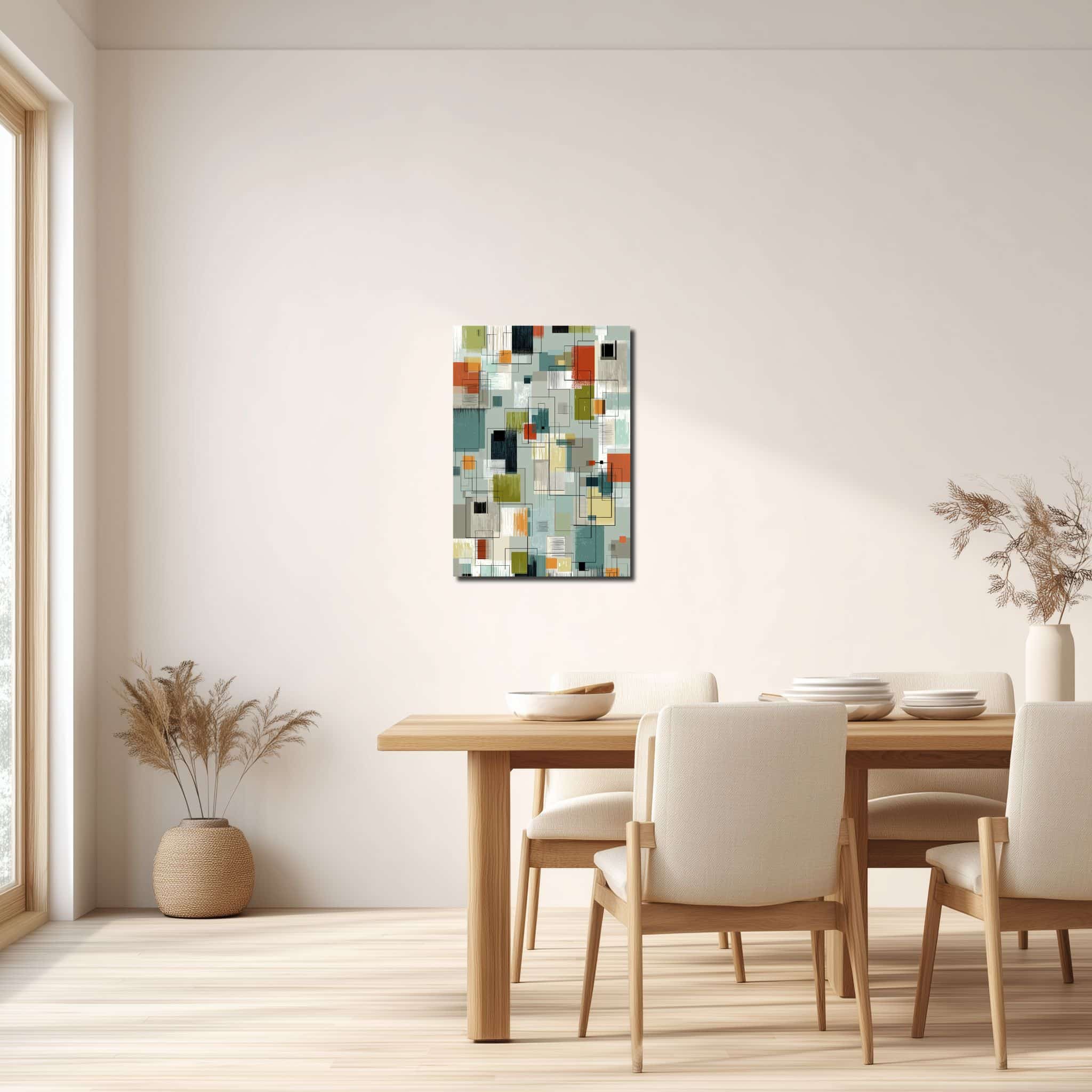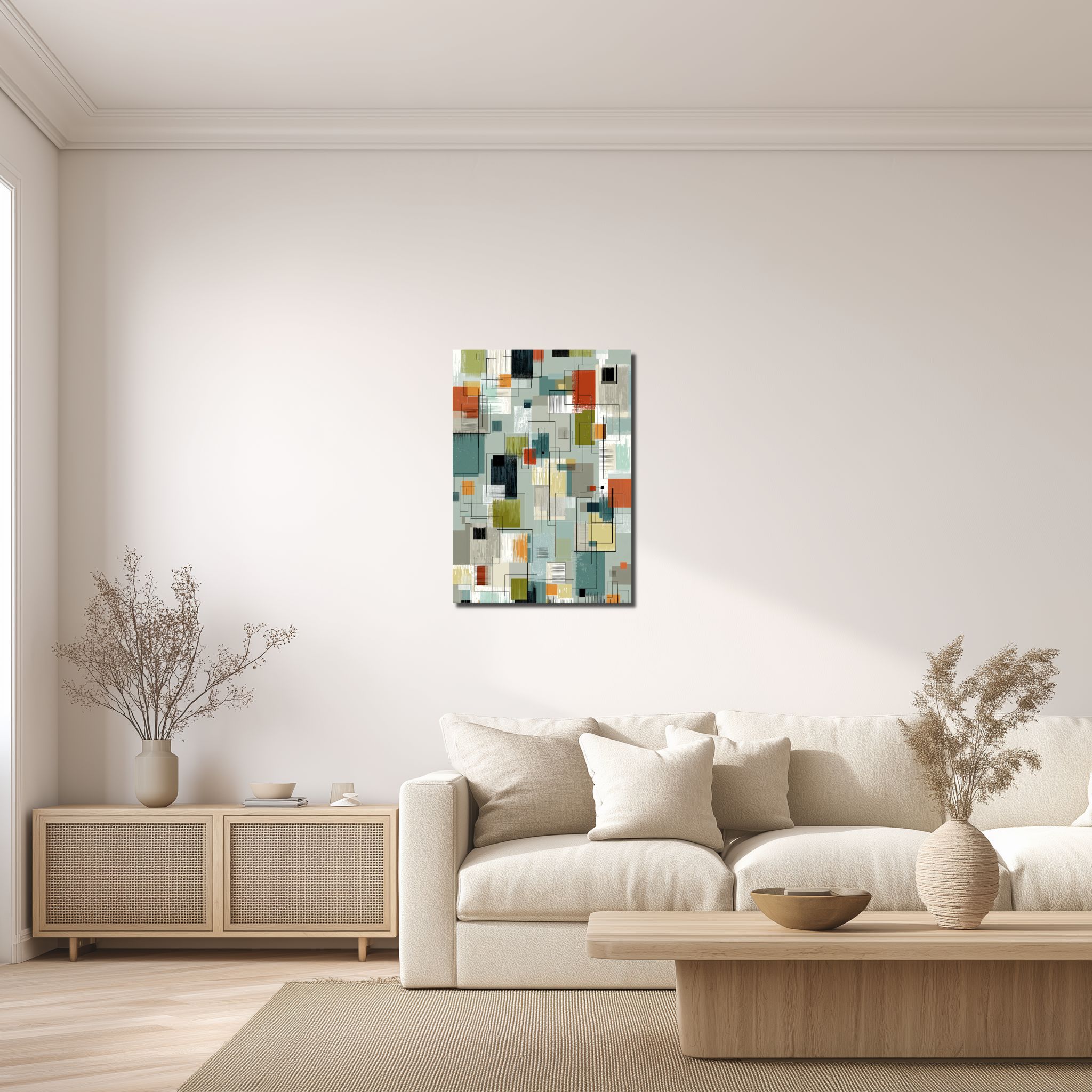 セージグリーン幾何学 キャンバスアートは、長方形や線のフレーム、重なりのある色面を縦構図でまとめた、静かな存在感が魅力の一枚です。版画風の質感が加わることで、洗練された中にも奥行きが生まれ、壁面に知的なリズムを添えます。