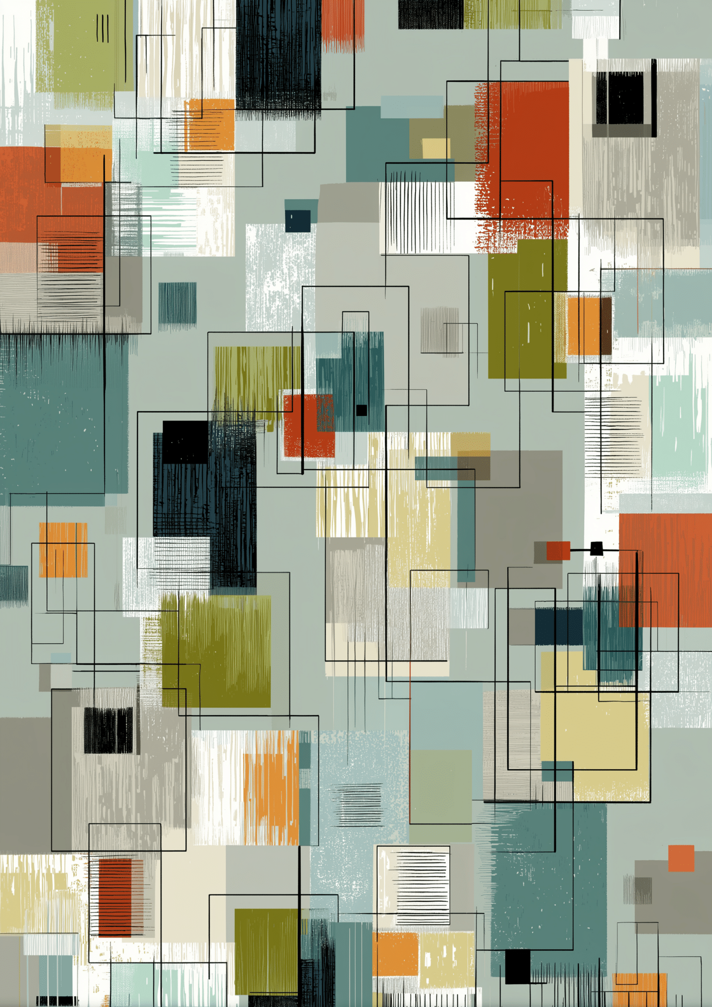 幾何学的な色面と線の重なりが、壁面に静かな奥行きをつくります。