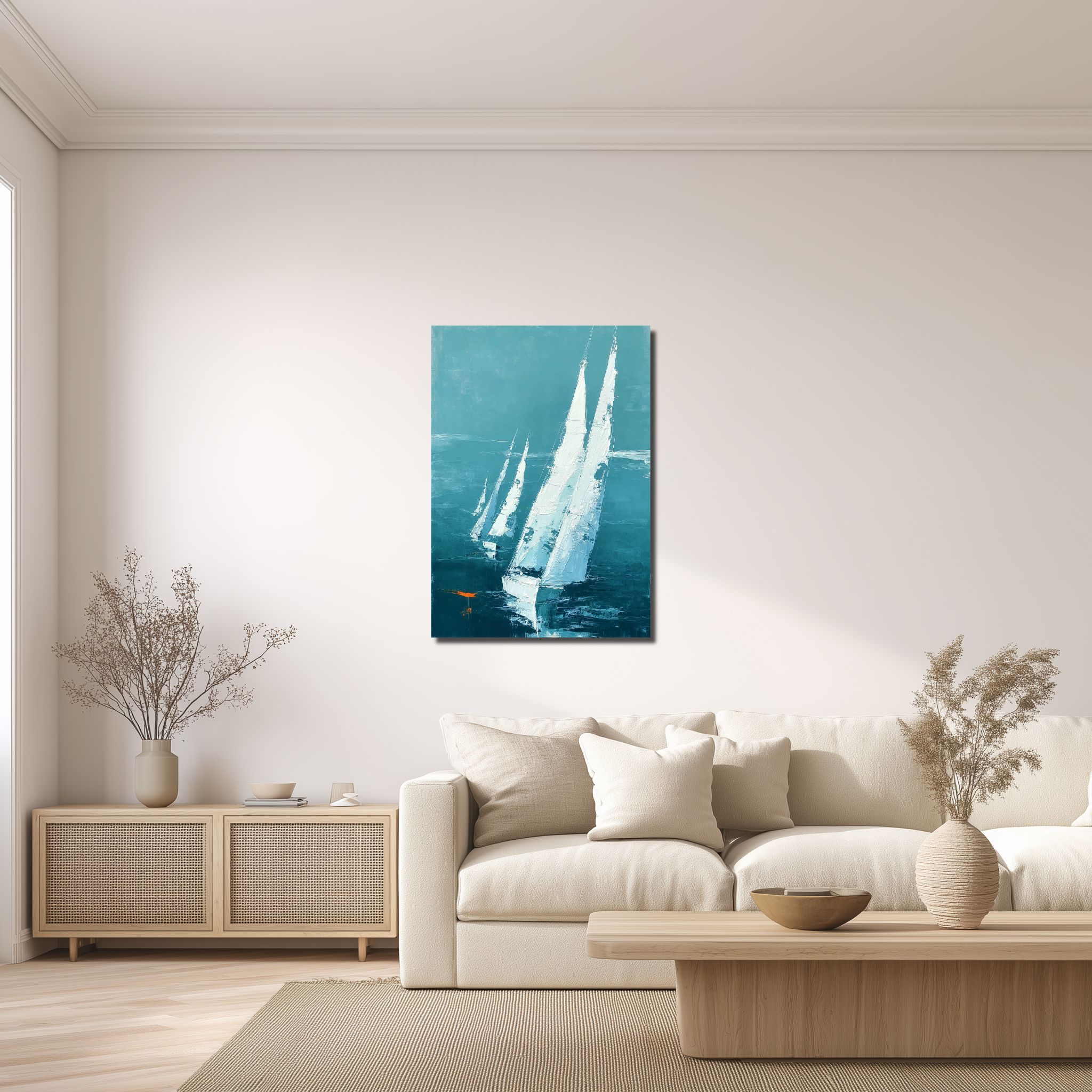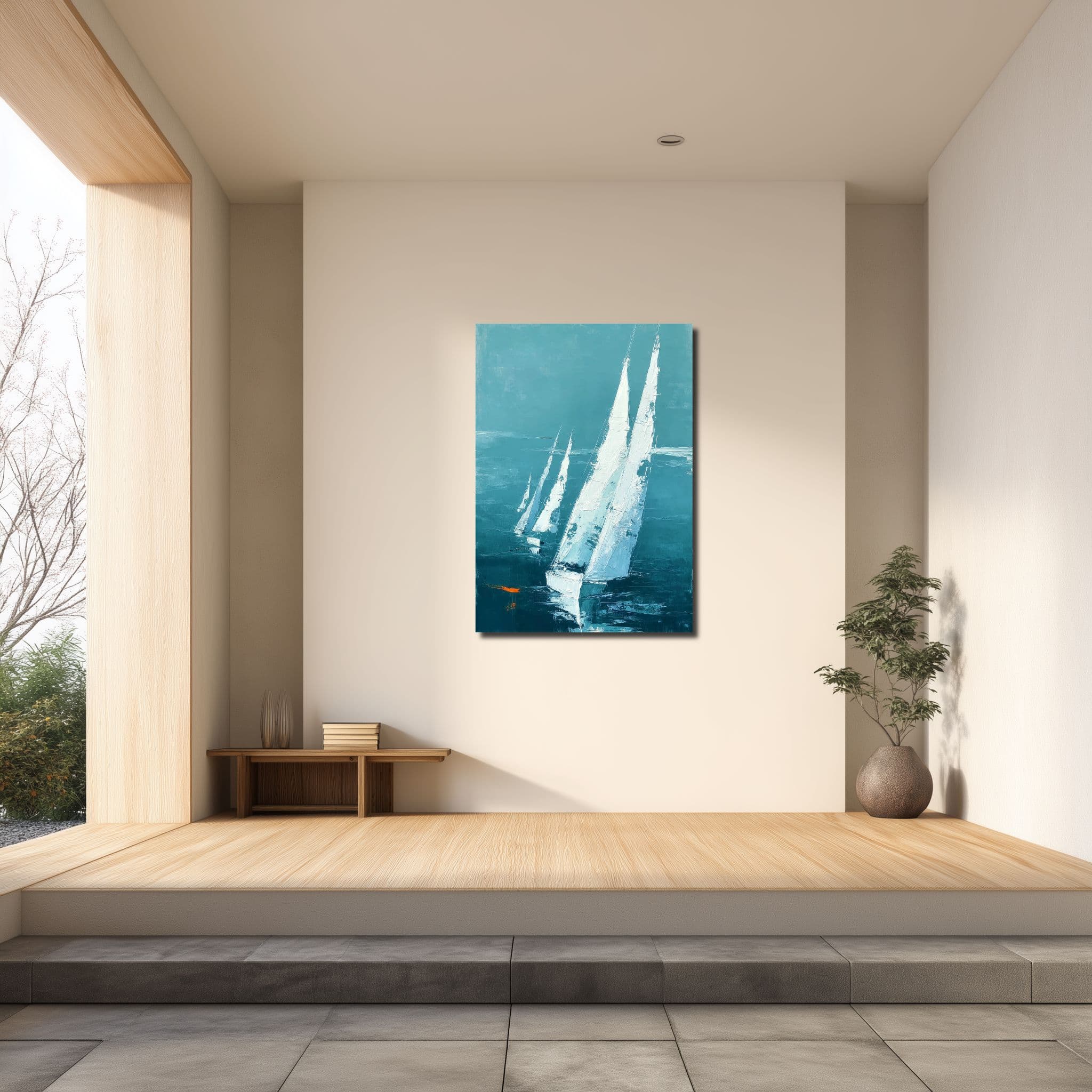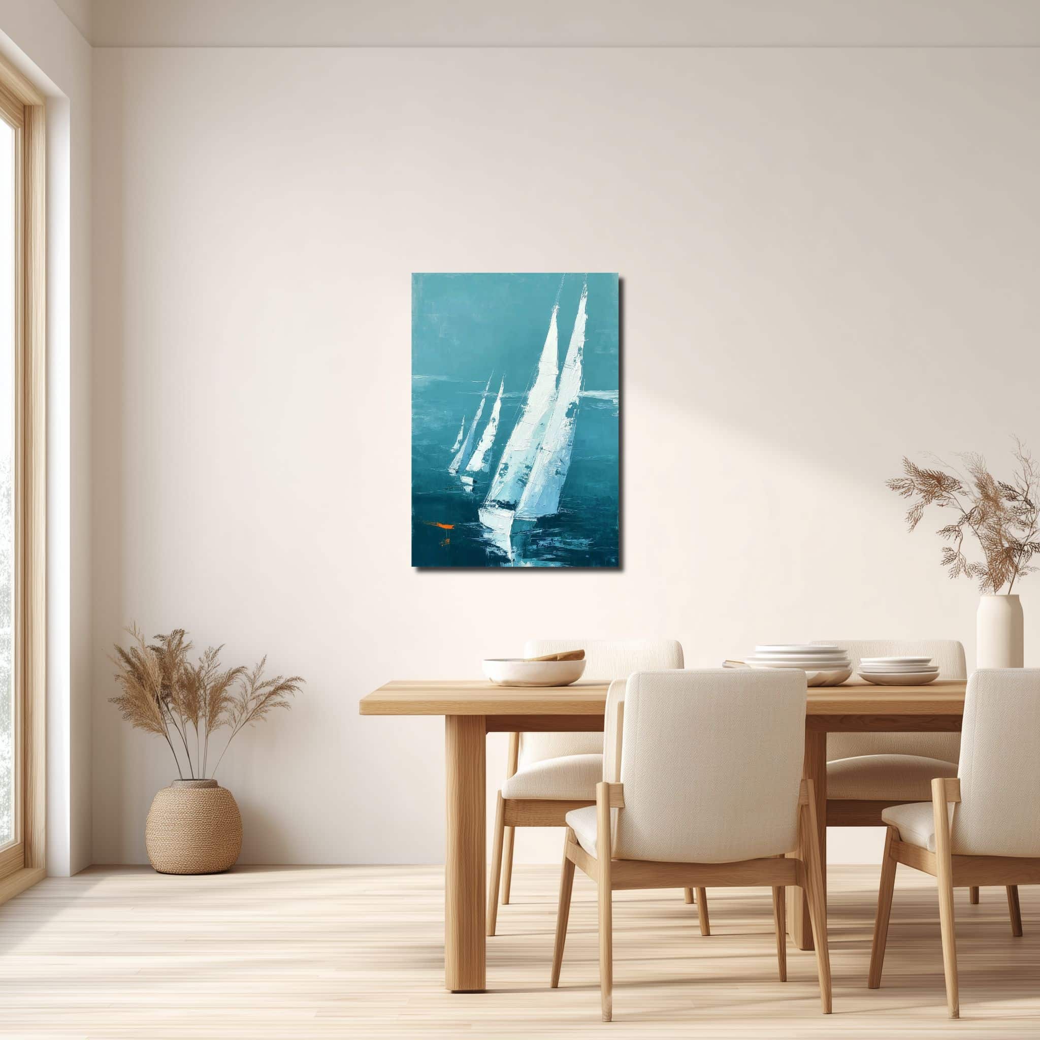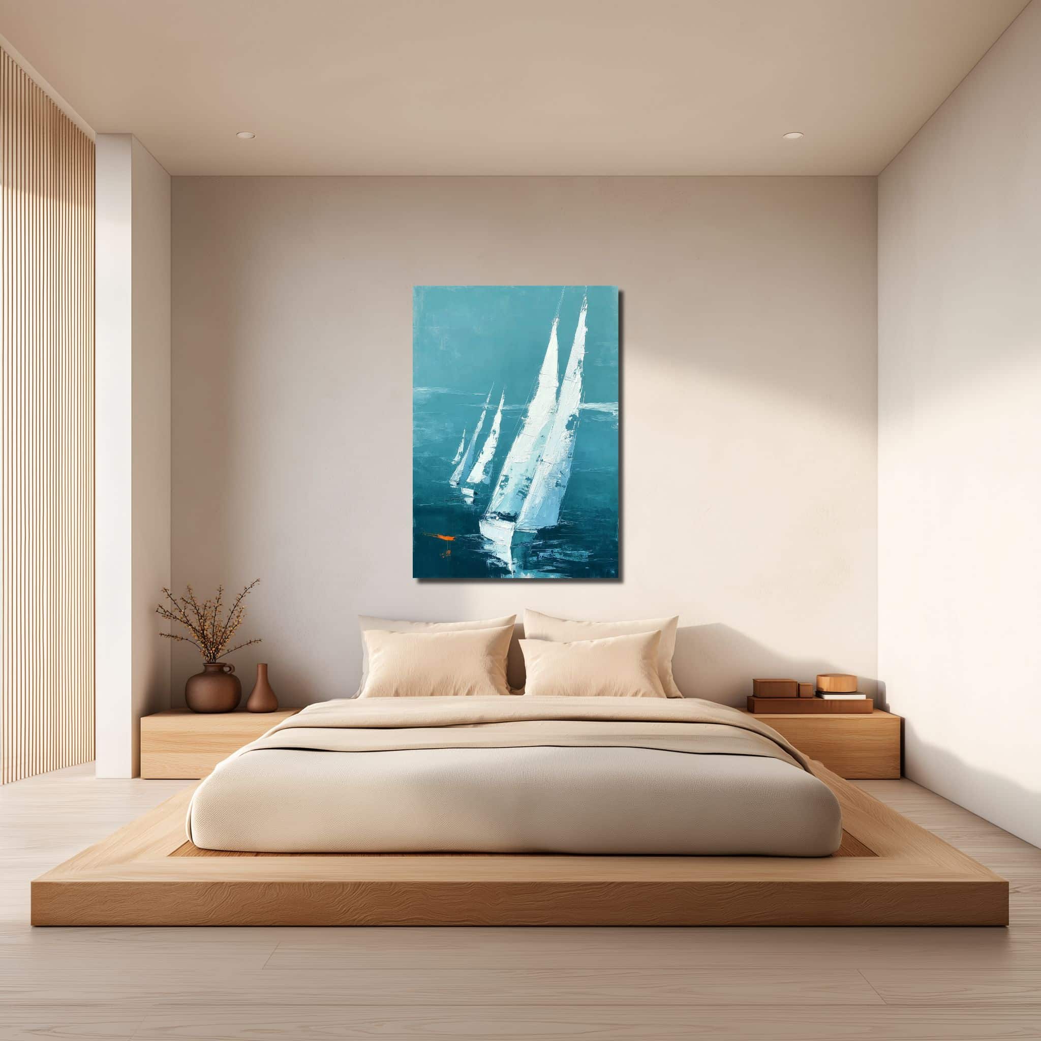 青緑の帆船海景 キャンバスアートを、静かな抜け感とともに楽しめる一枚です。