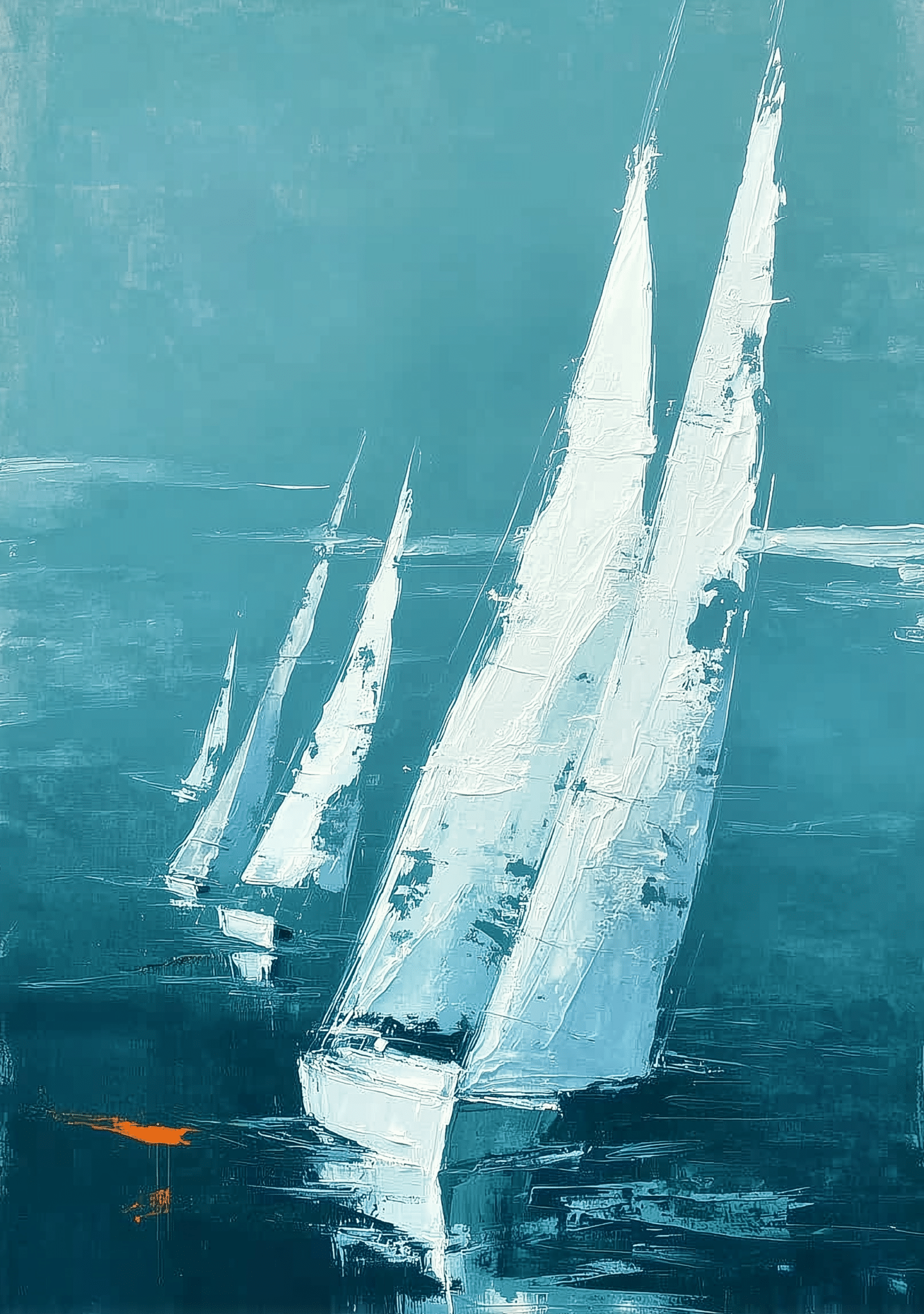 青緑、淡い水色、濃紺が重なる海面に、白い帆の明るさがきれいに映える配色です。広めの余白があるため、色数に動きがあっても見え方は軽やかで、壁に掛けたときも圧迫感が出にくいのが特長です。ところどころに入る橙の小さな差し色が単調さを抑え、青緑の帆船海景 キャンバスアート にほどよい温度を加えています。近くでは筆の重なり、少し離れると海風のような抜け感が感じられます。