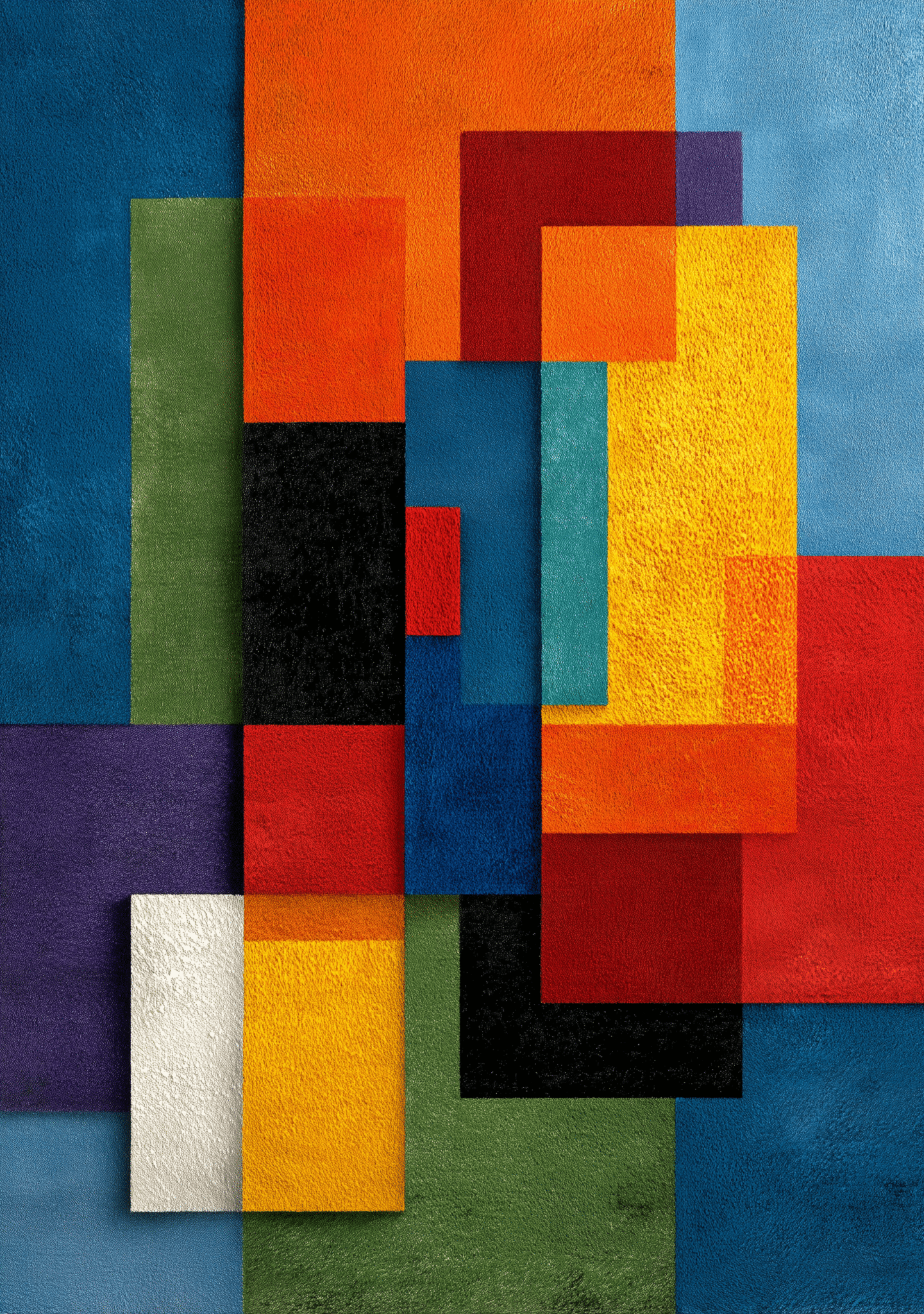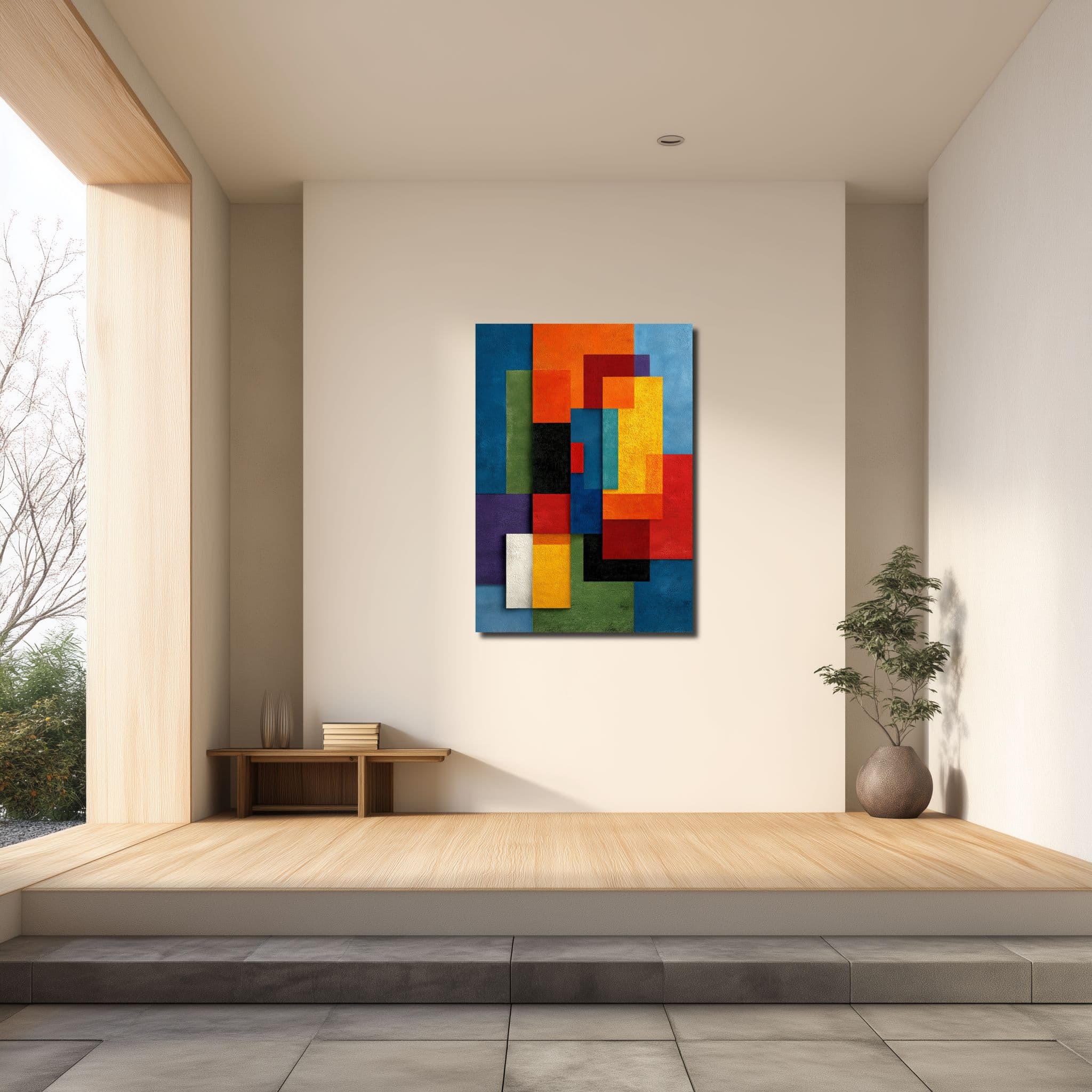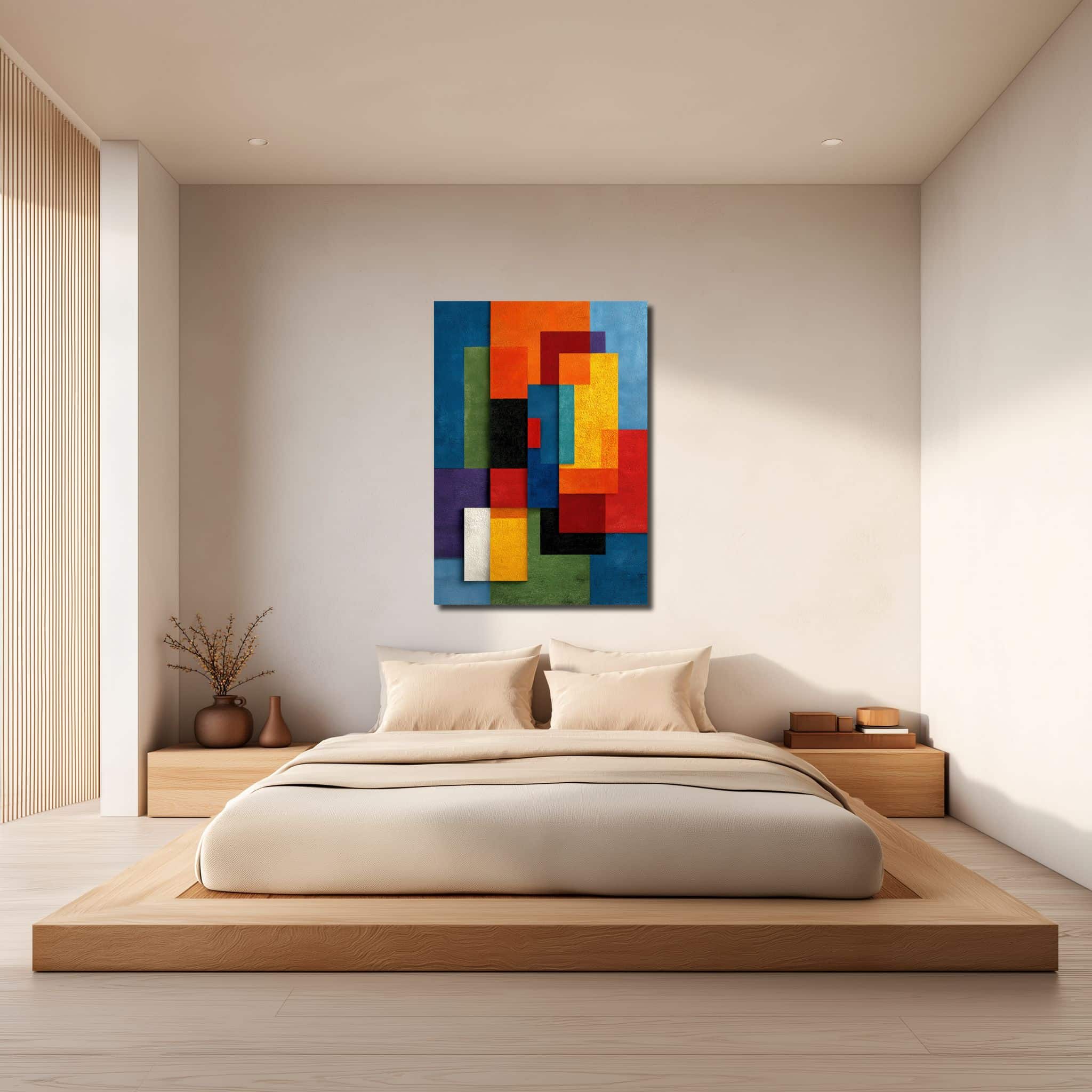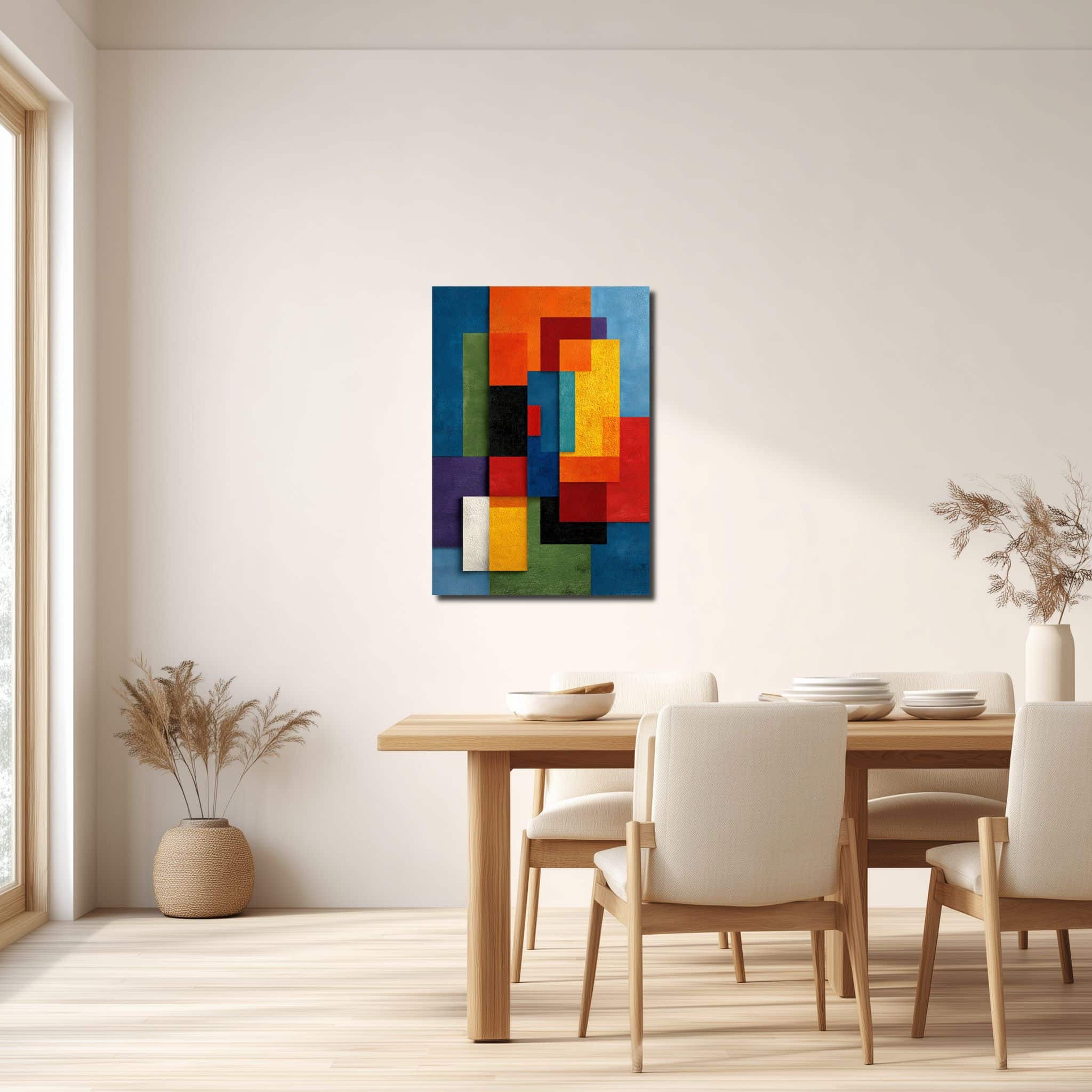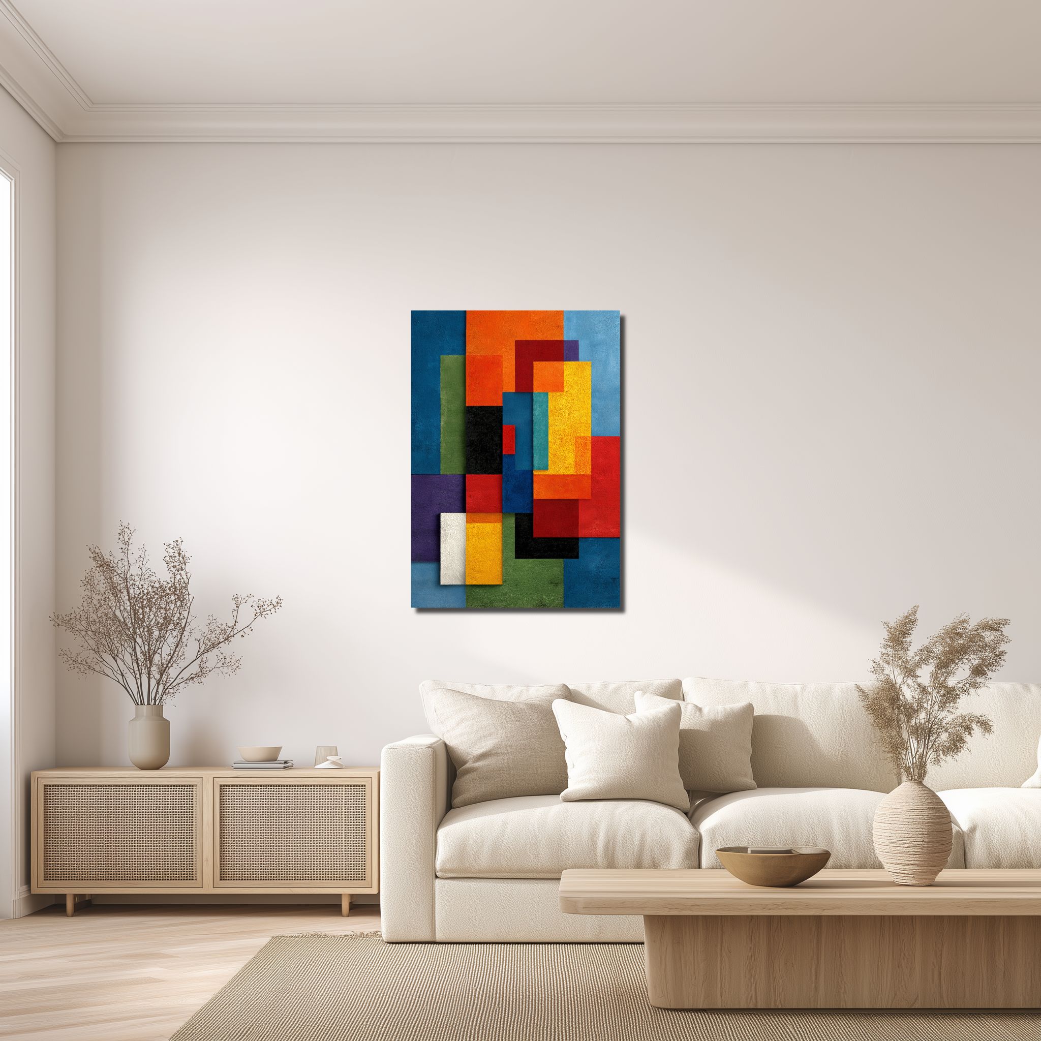 青やオレンジ、赤、黄、緑の色面を重ねながら構成された鮮やか色面抽象 キャンバスアートは、直線的なフォルムと縦構図が生み出すリズムによって、空間にすっきりとした存在感を与えます。重なり合う長方形の配置が単調になりすぎず、モダンでグラフィカルな印象を際立たせるため、壁面に飾るだけで洗練されたアクセントとして映える一枚です。