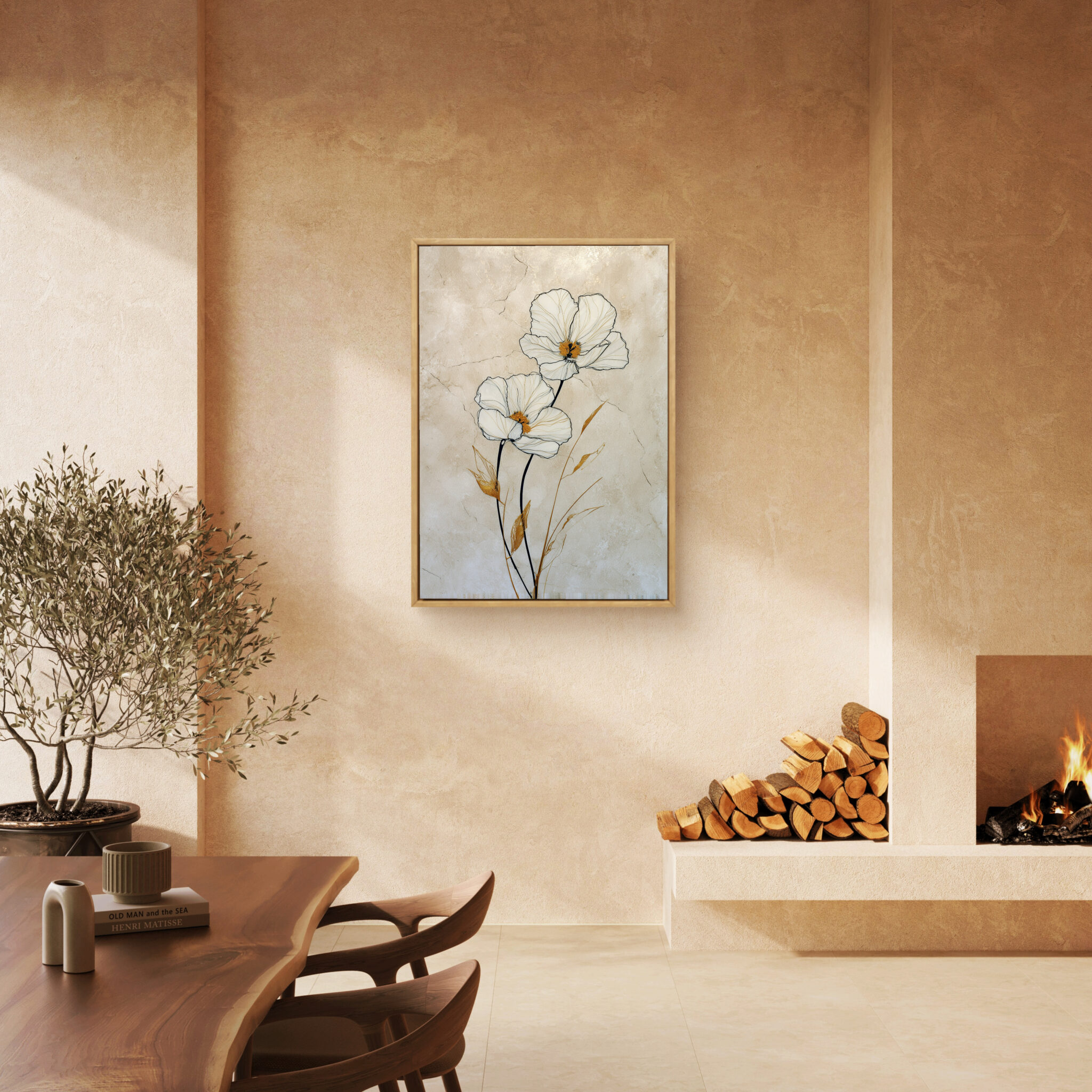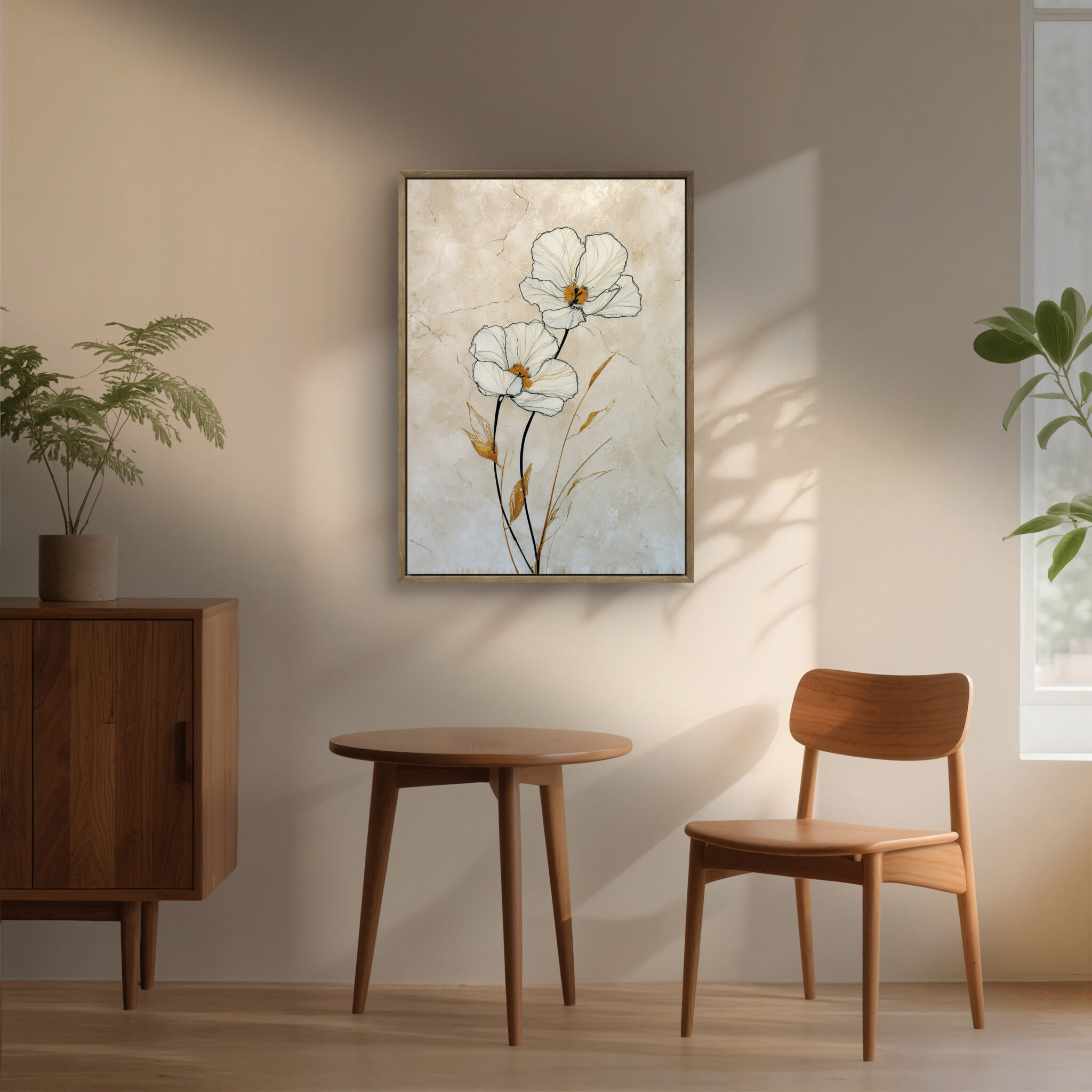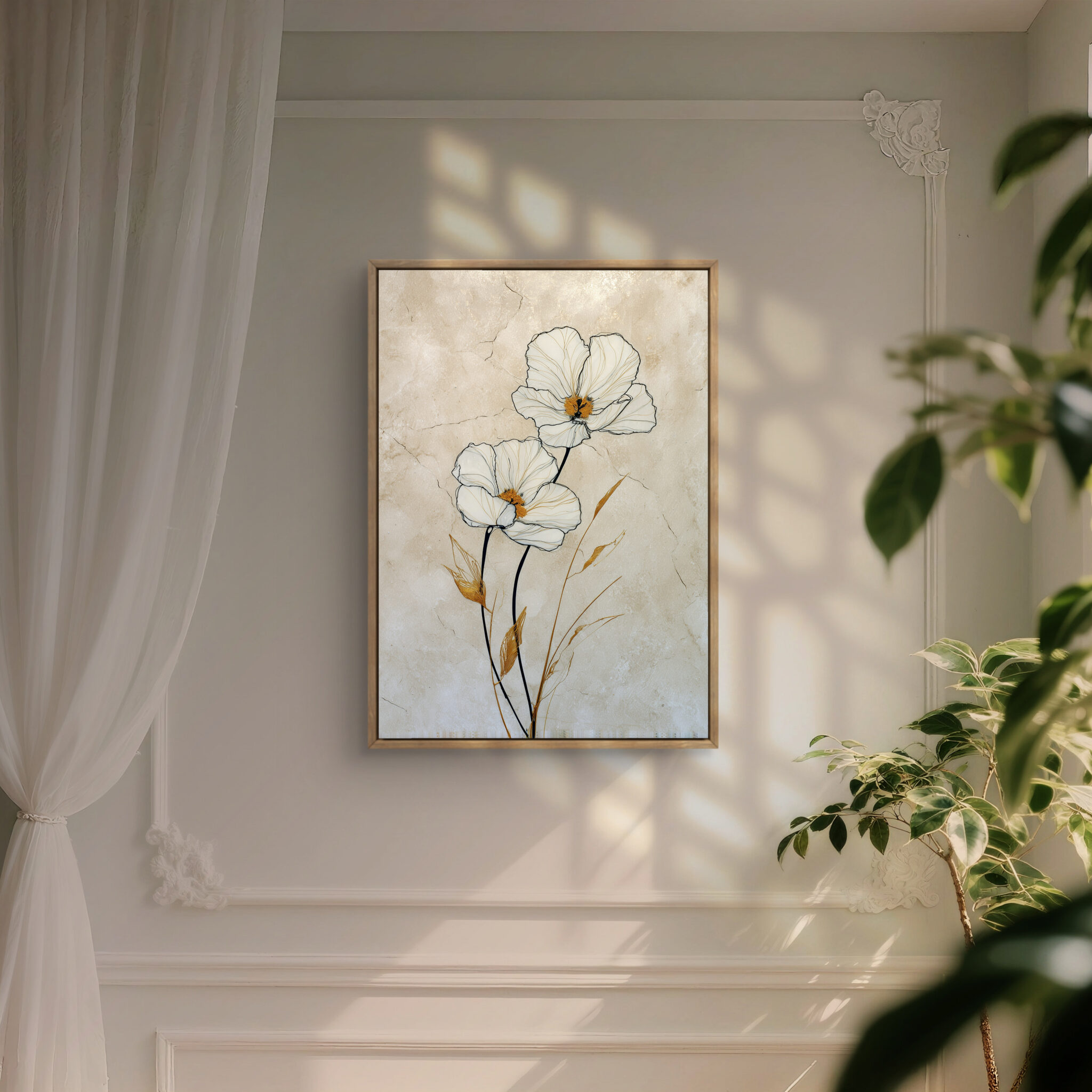 近くでは白い花びらや葉の線が見え、少し離れると全体がすっきりとした縦の流れでまとまります。金色の葉は強すぎず、白やベージュの空間にも自然になじみます。落ち着いたインテリアに少し明るさを加えたいときにも向いています。