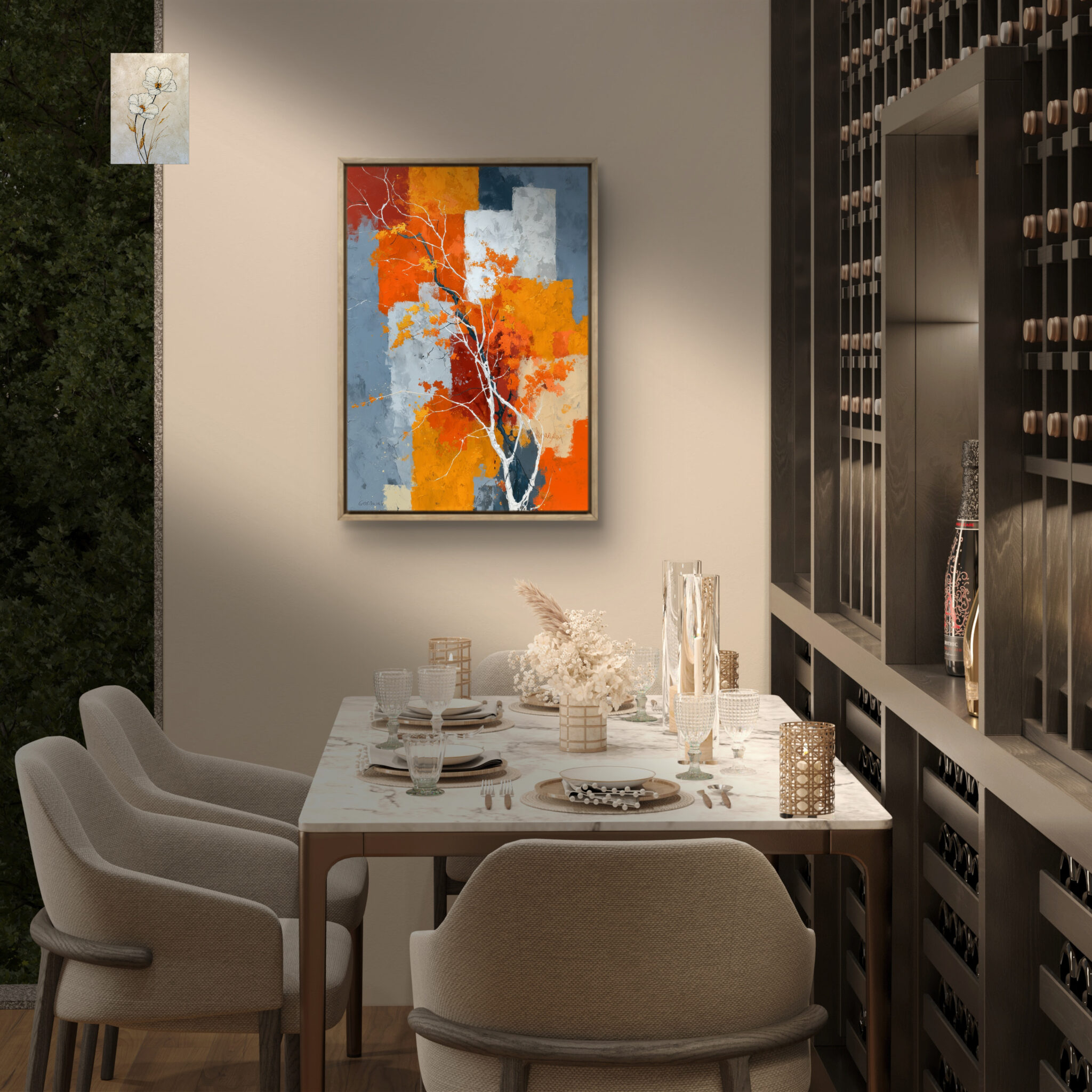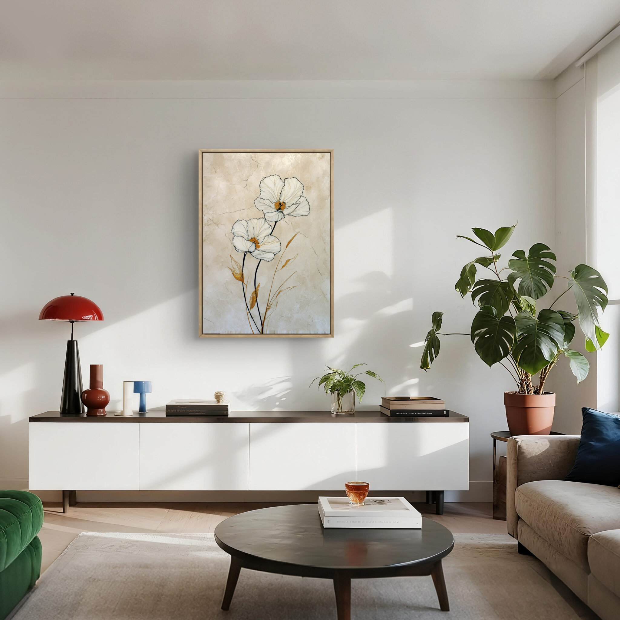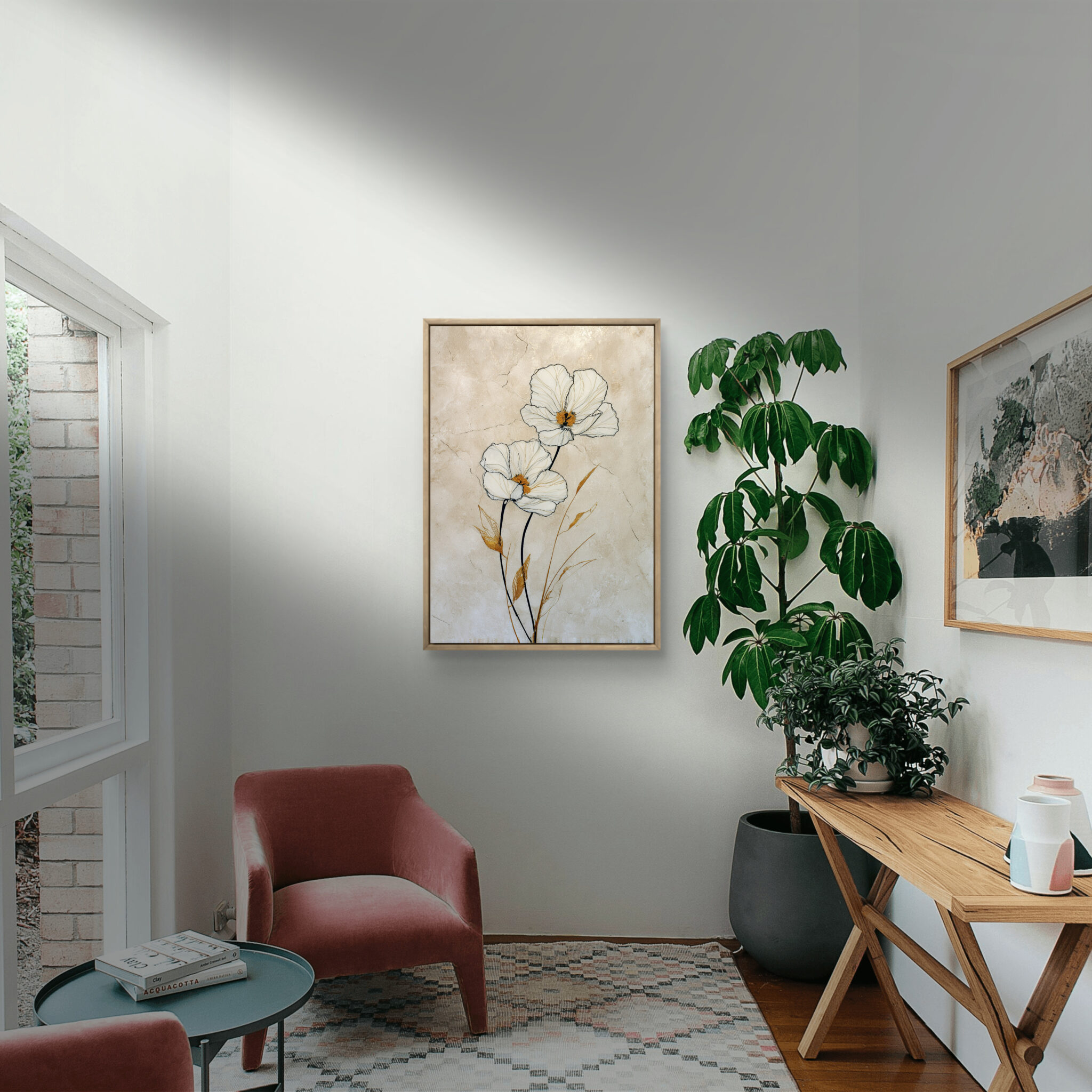 近くでは白い花びらや葉の線が見え、少し離れると全体がすっきりとした縦の流れでまとまります。金色の葉は強すぎず、白やベージュの空間にも自然になじみます。落ち着いたインテリアに少し明るさを加えたいときにも向いています。
