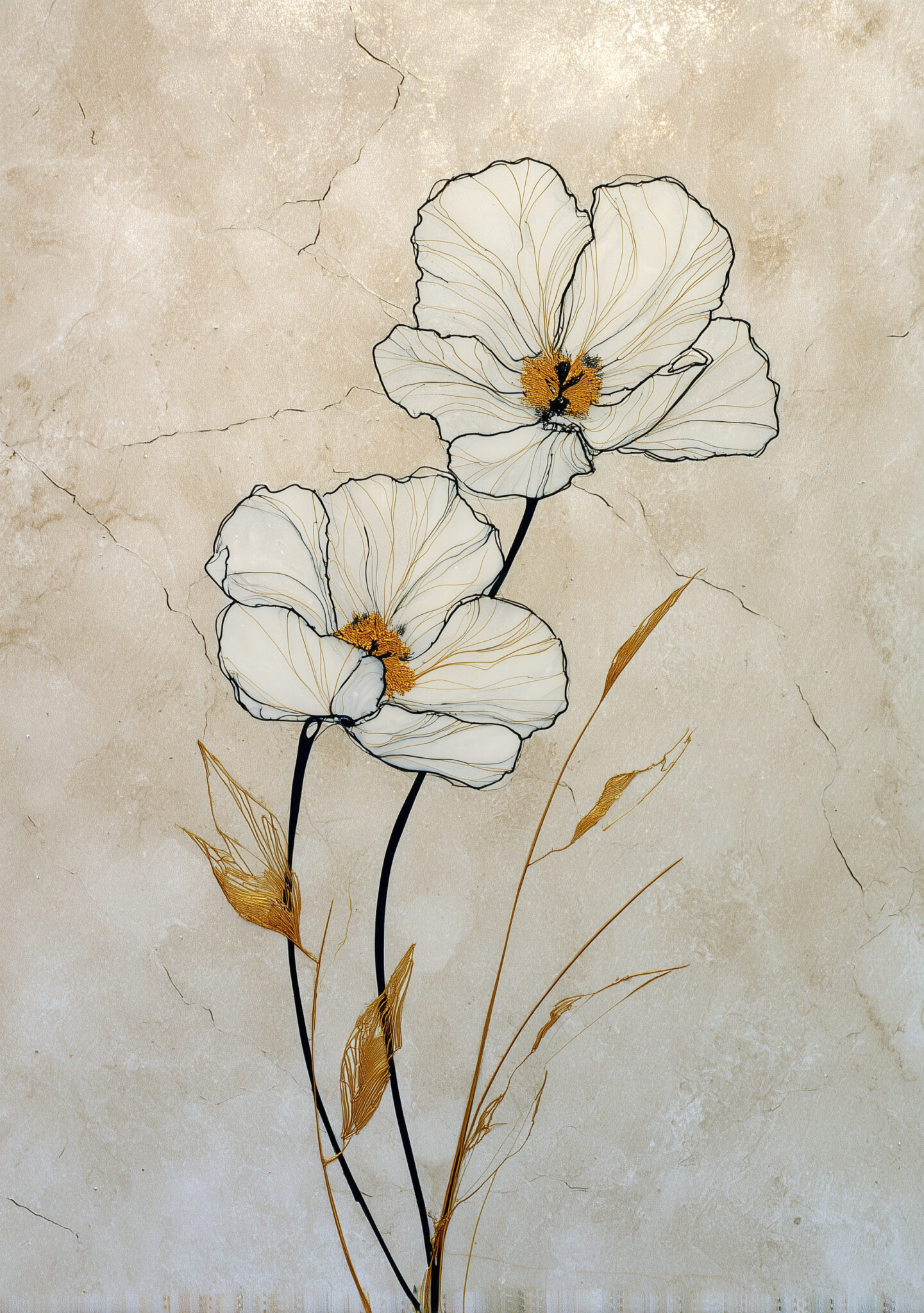 白い花と金色の葉を繊細な線で描いた、縦長のボタニカル作品です。花のやわらかさに金色の葉が少し華やぎを添え、壁面を静かに整えます。白花と金葉 フラワーアートとして、上品に飾りやすい一枚です。
