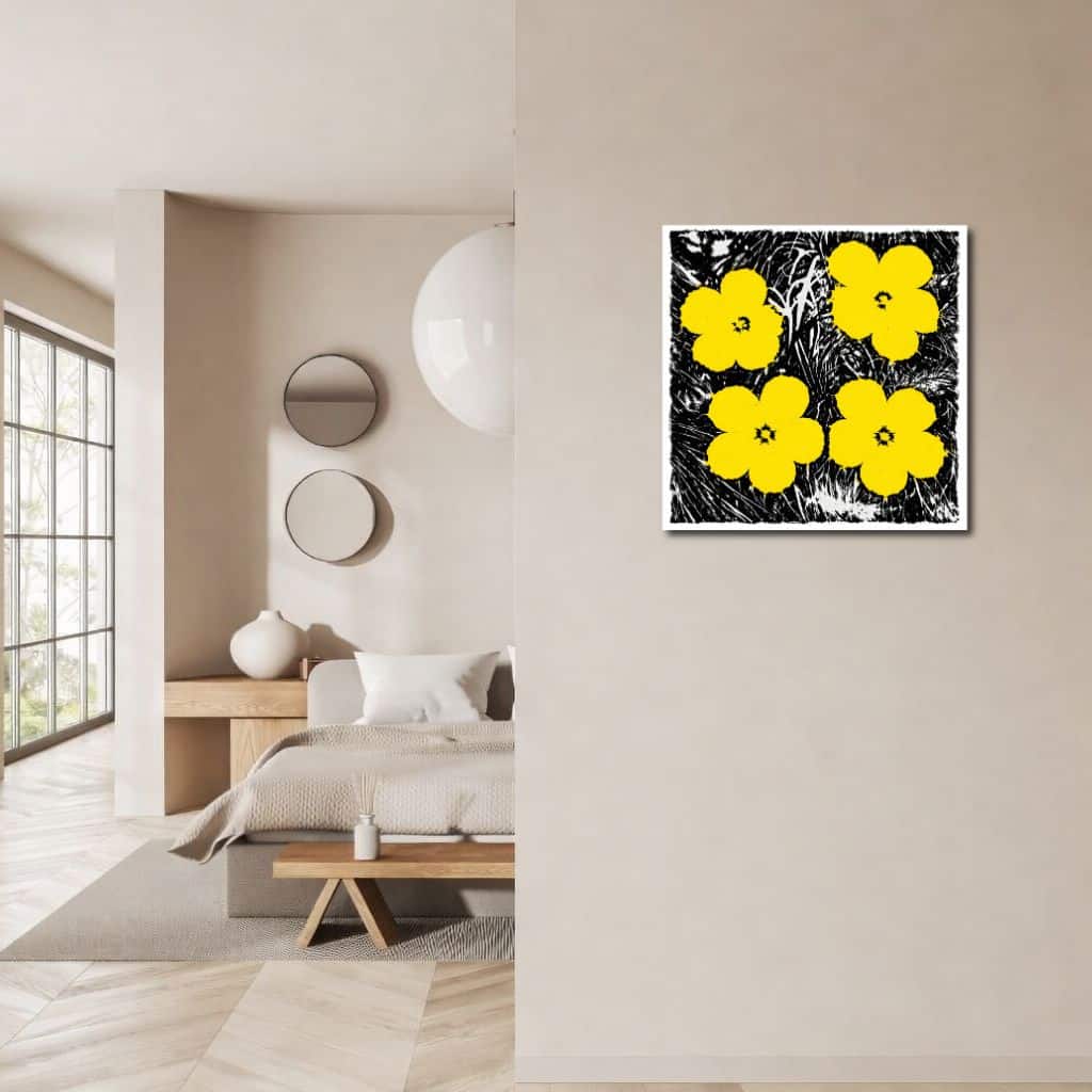 イエローの花とブラック背景のコントラストが印象的な、北欧ミニマル 抽象 キャンバスアートです。