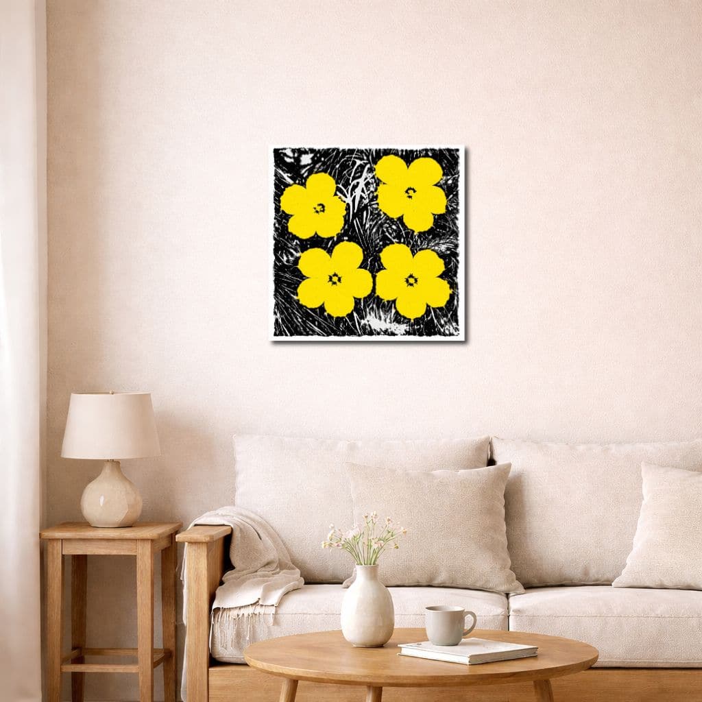 鮮やかなイエローの花とブラックの背景を重ねることで、イエローフラワー シルエット キャンバスアートならではの印象的なコントラストを空間に与えます。視線を引きつける華やかさがありながらも、構図が整理されているため重たくなりすぎず、お部屋をすっきりと見せつつモダンで個性のある雰囲気へ整えてくれる一枚です。